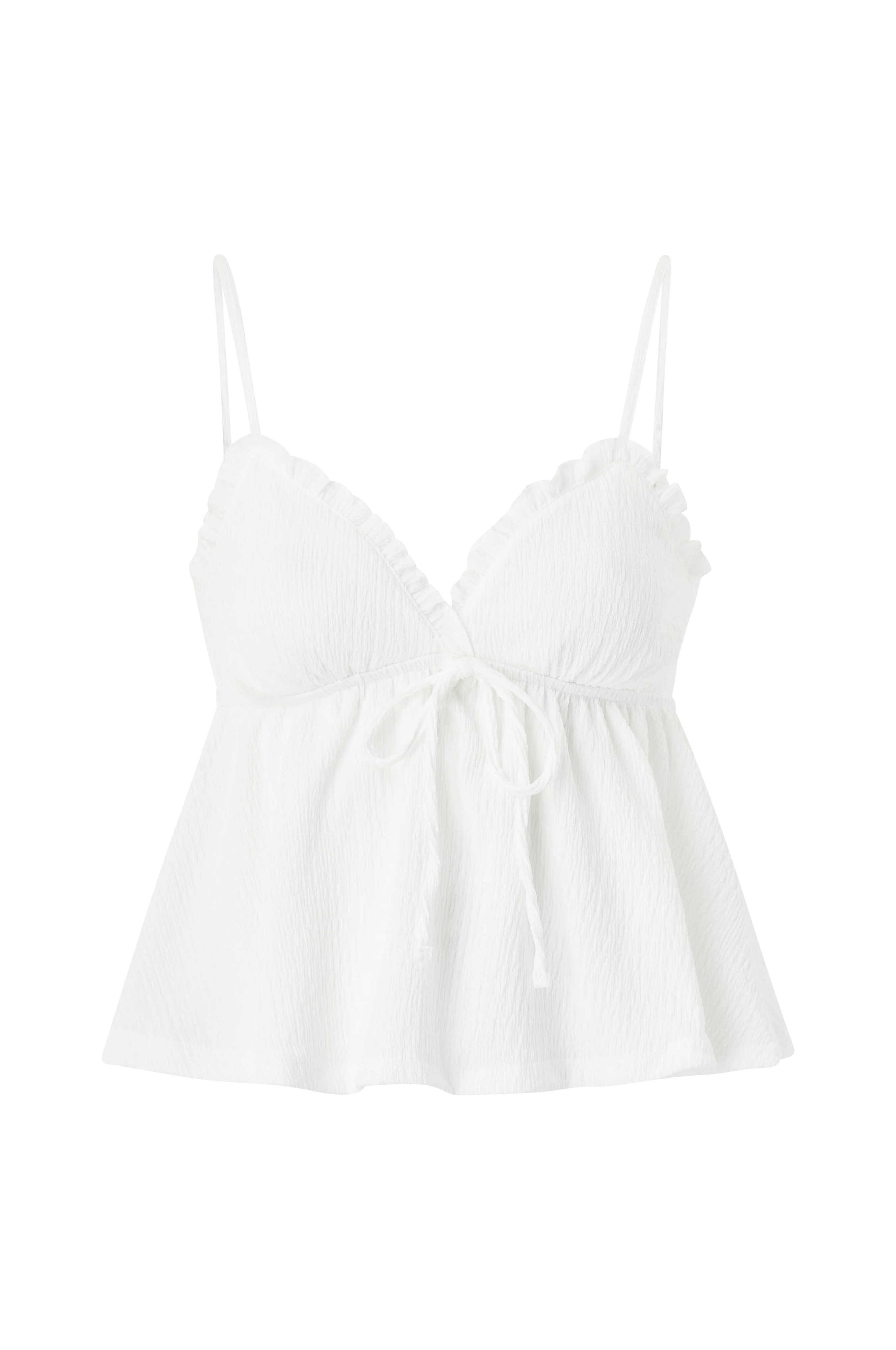 • Top med struktur og nedre del med svaj• V-formet halsudskæring med kort flæsekant hele vejen rundt• Smalle, justérbare skulderstropper med bindebånd i ryggen• Træksnørre ved taljen• Inderfor ved brystet