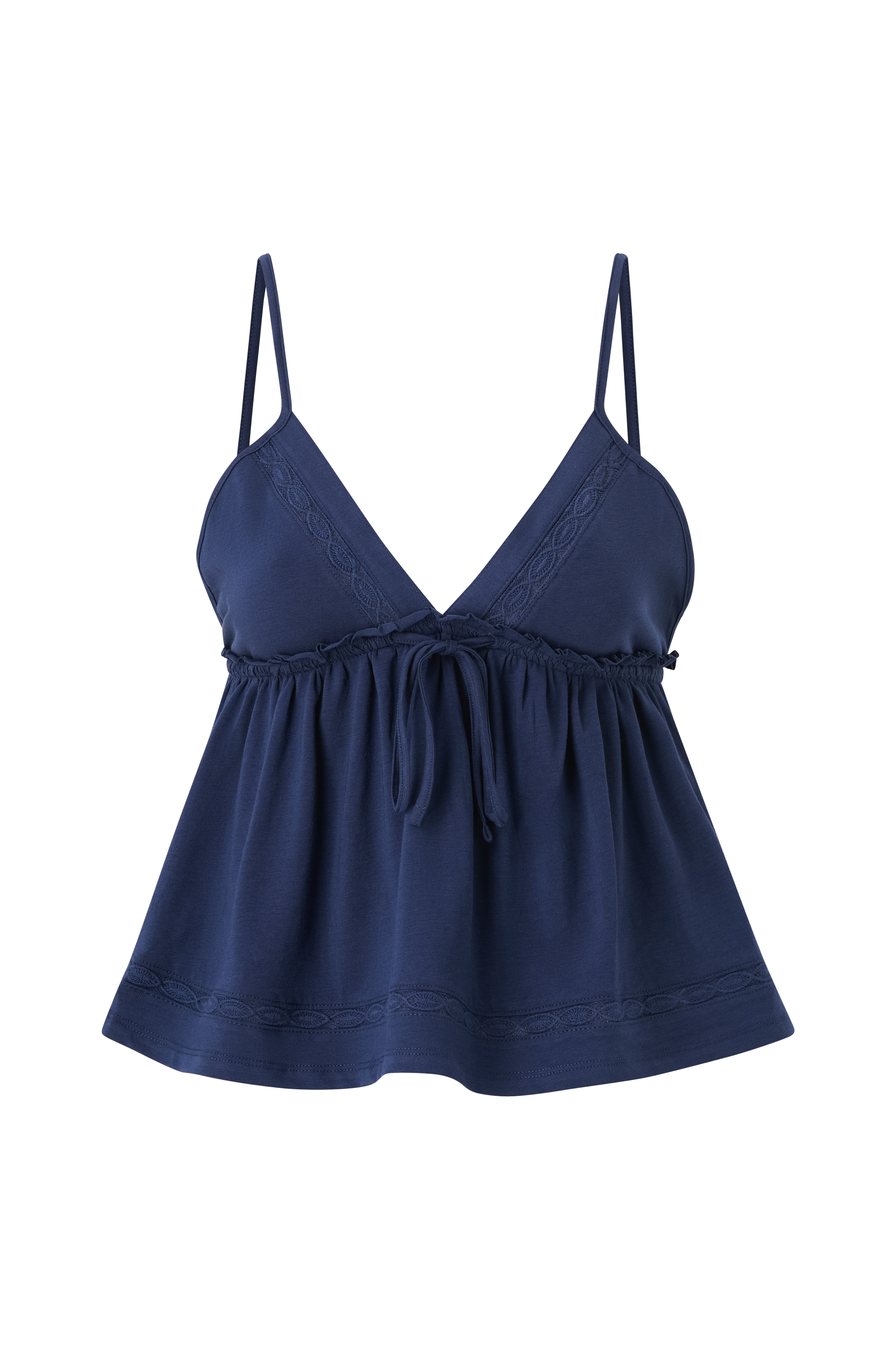 • Ærmeløs, elastisk top• Tynde, justérbare skulderstropper• Blondedetaljer på kopperne og ved nederste kant• Justérbar træksnørre med flæsekant under brystet• Nedre del med svaj