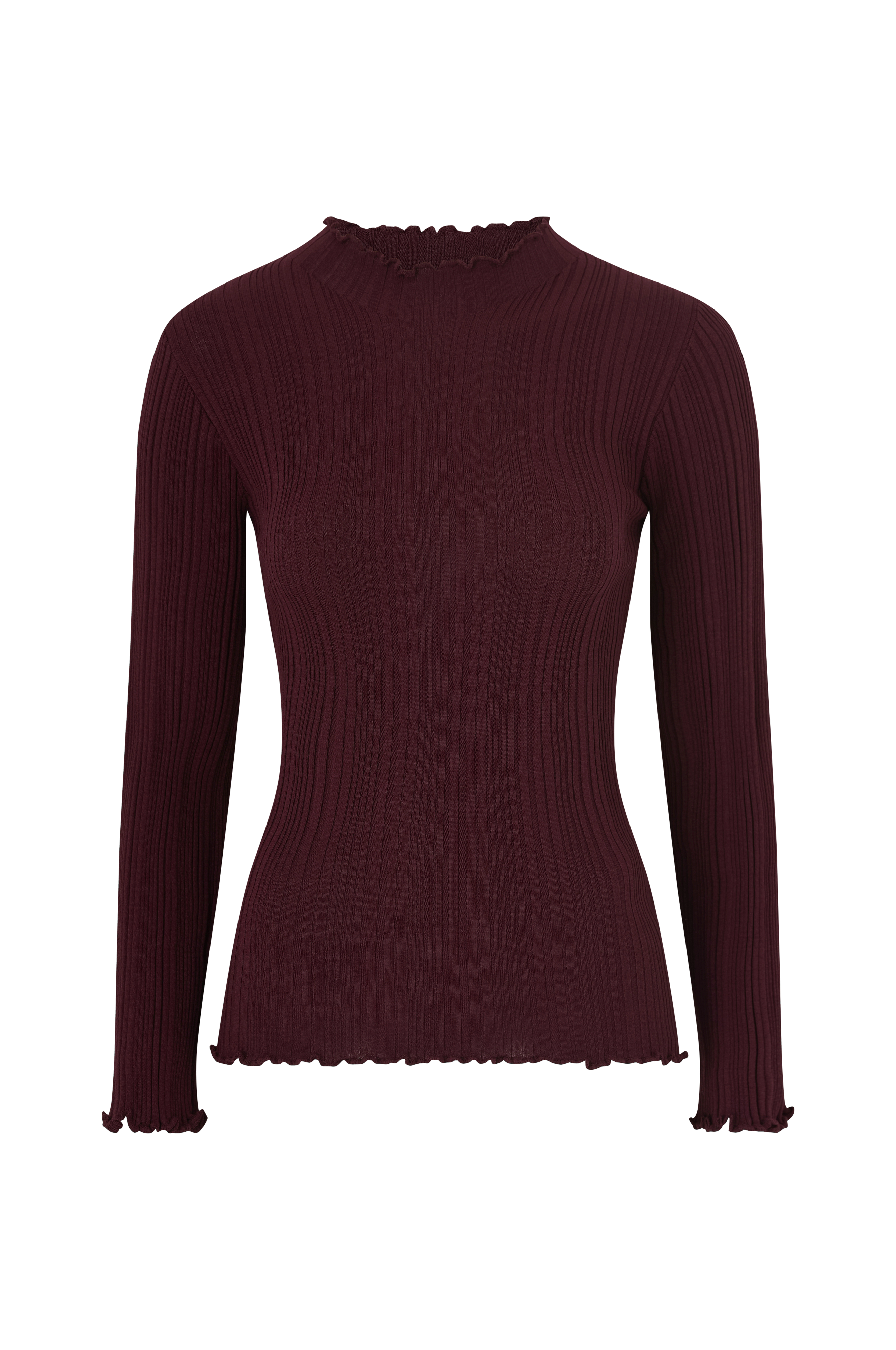 • Elastisk, figursyet, langærmet top med ribbet, fintstrikket struktur• Halvhøj halsudskæring• Bølgede, strikkede kanter ved ærmeafslutningerne, nederst og rundt om halsen
