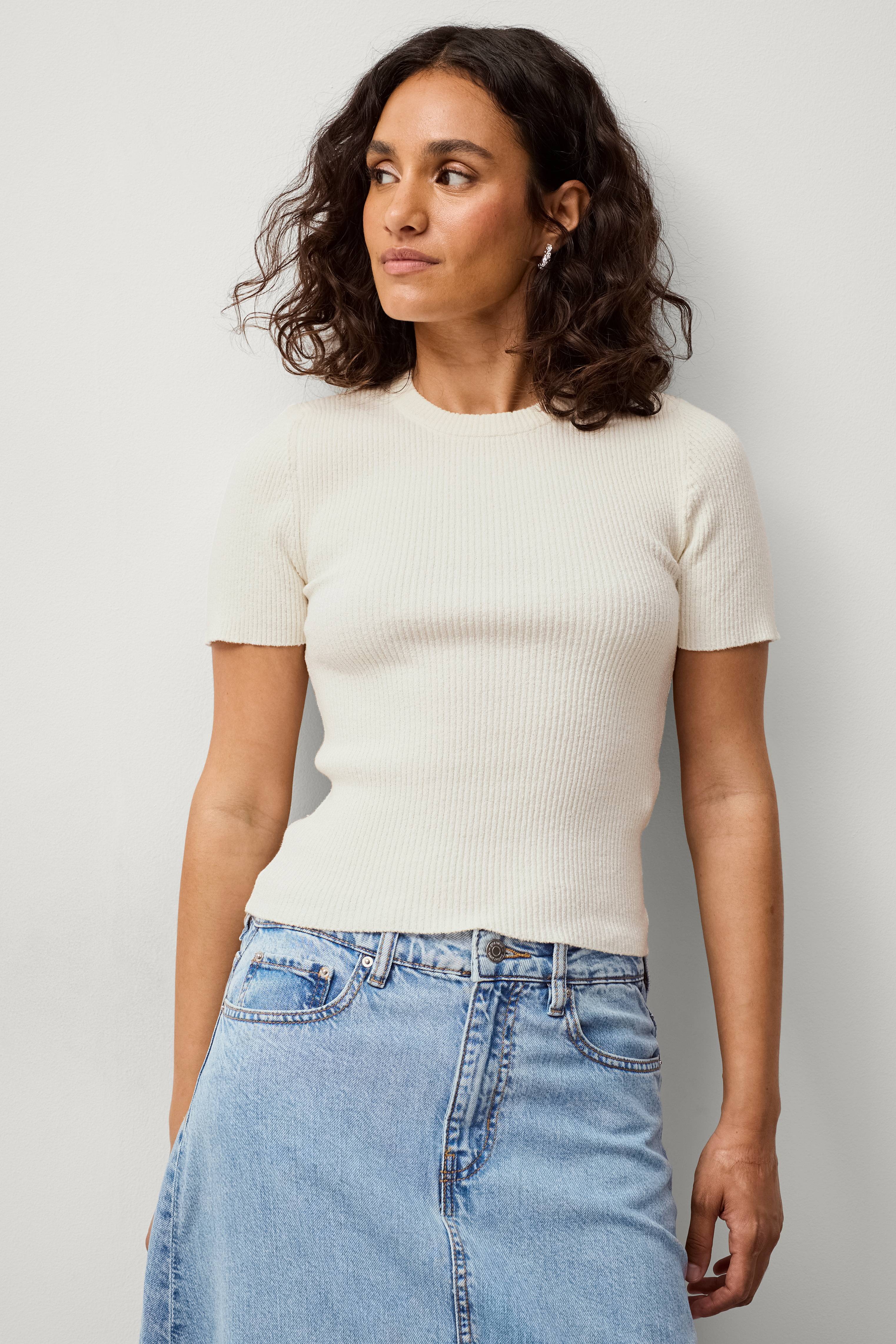 • Figursyet, kortærmet top• Ribbet, elastisk materiale