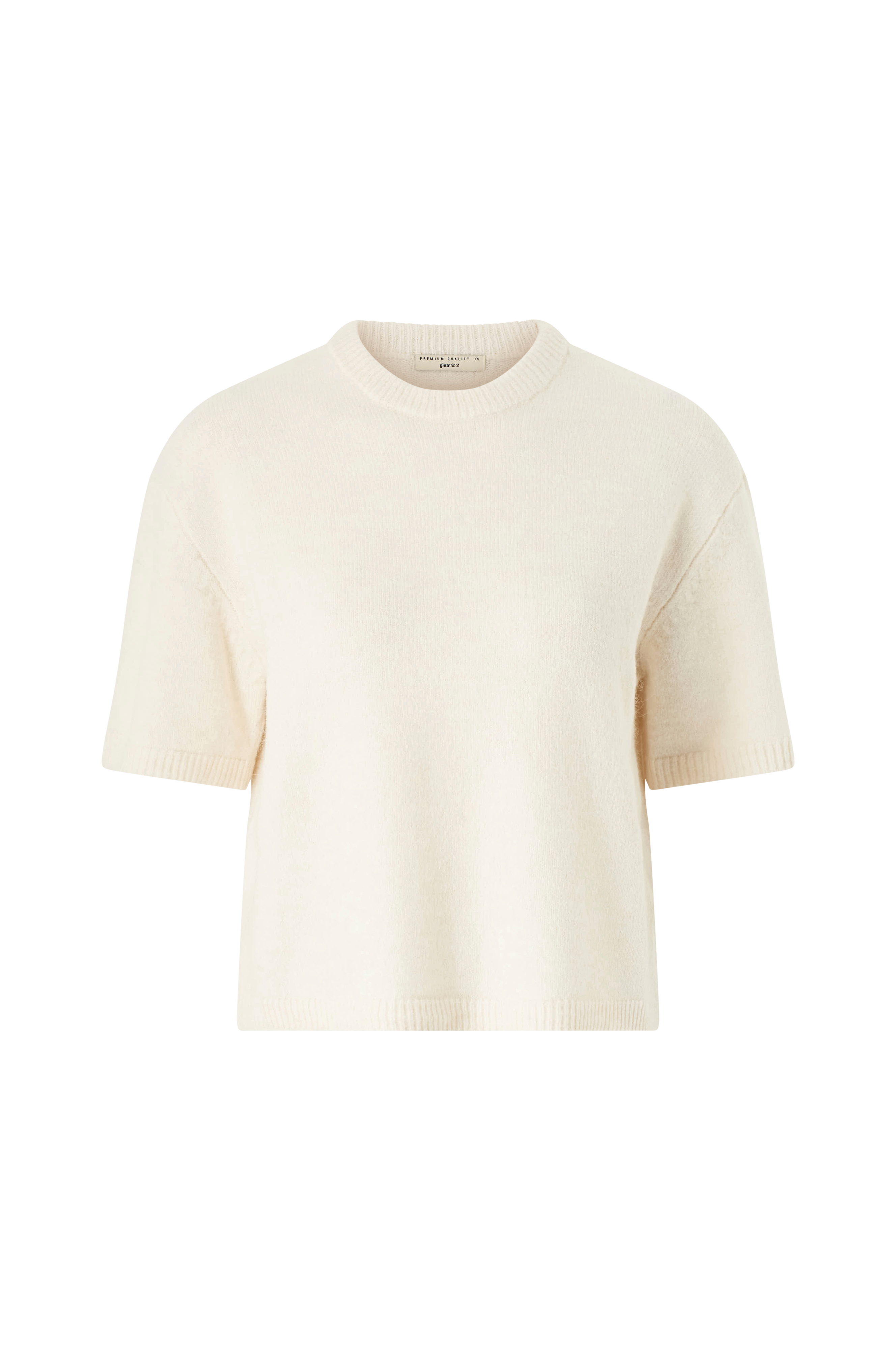• Lige, fintstrikket model• Rund hals med ribstrikket kant• Kort ærme• Ribstrik ved nederste kant og ved manchetterne