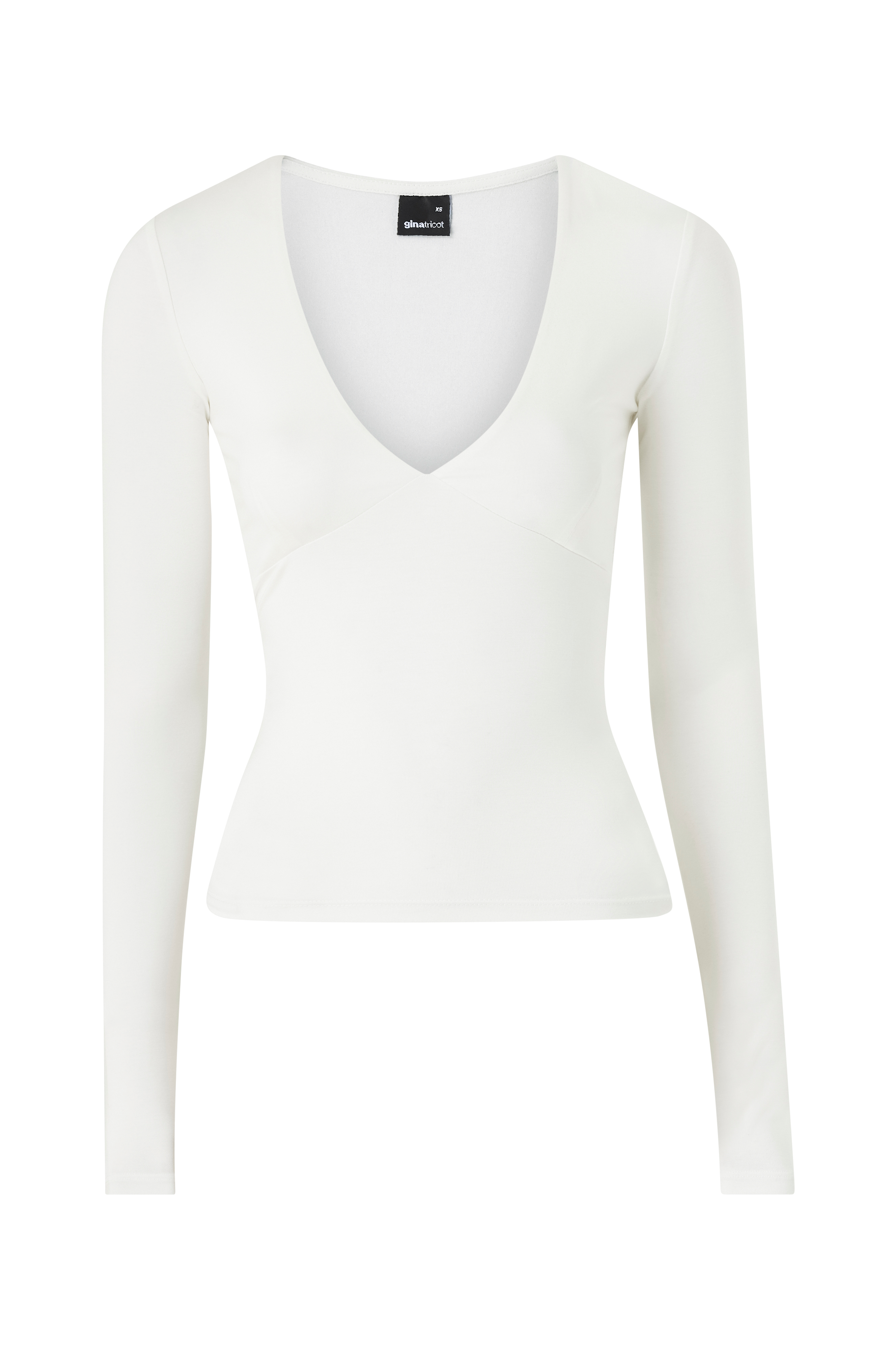 • Langærmet, figursyet top i blødt materiale• V-formet, dyb halsudskæring ved fronten• Lille indsnit ved brystet