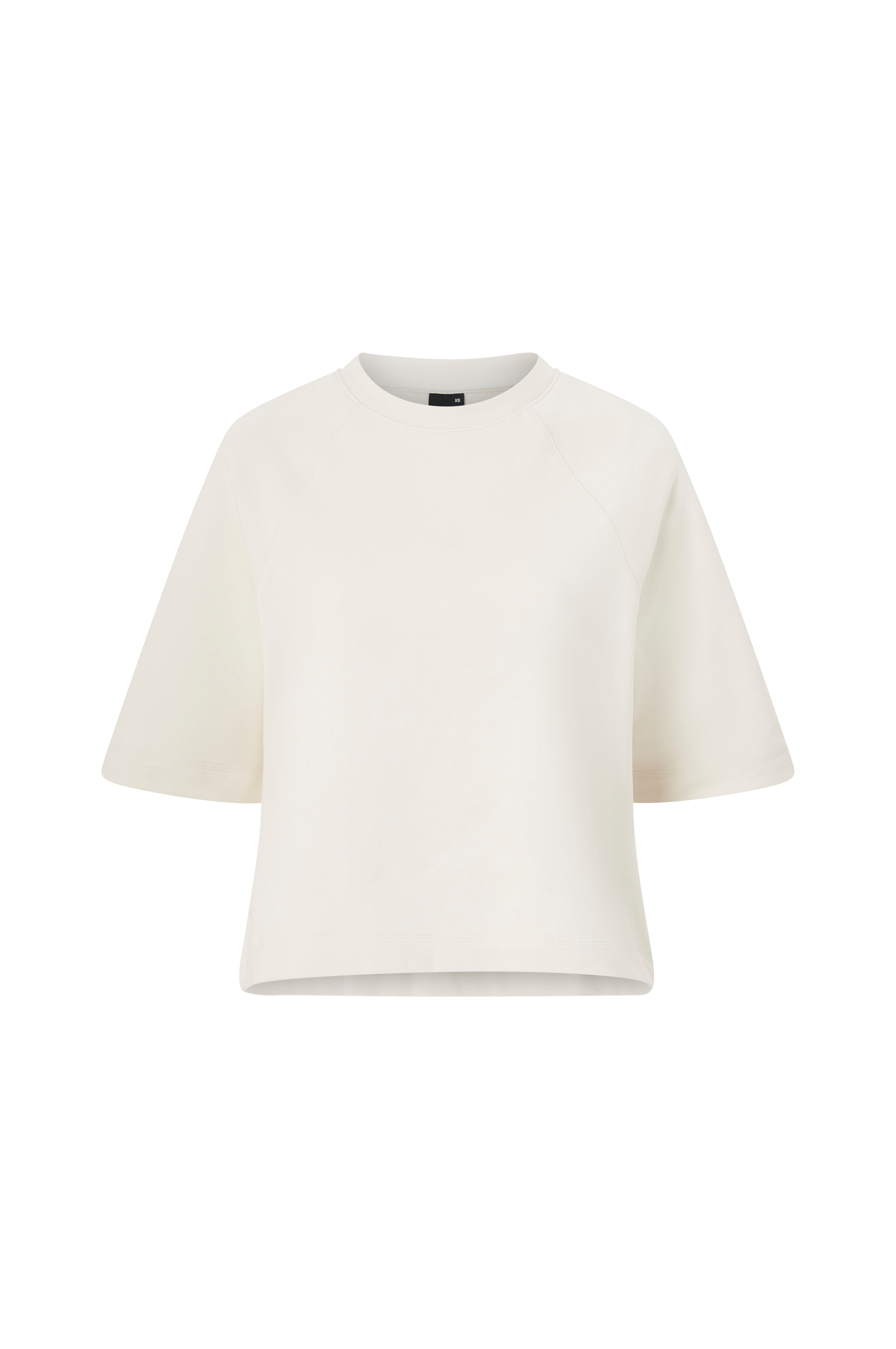 • Top i sweatshirt• Korte raglanærmer• Rund hals• Ribmanchetter ved manchetterne og nederst