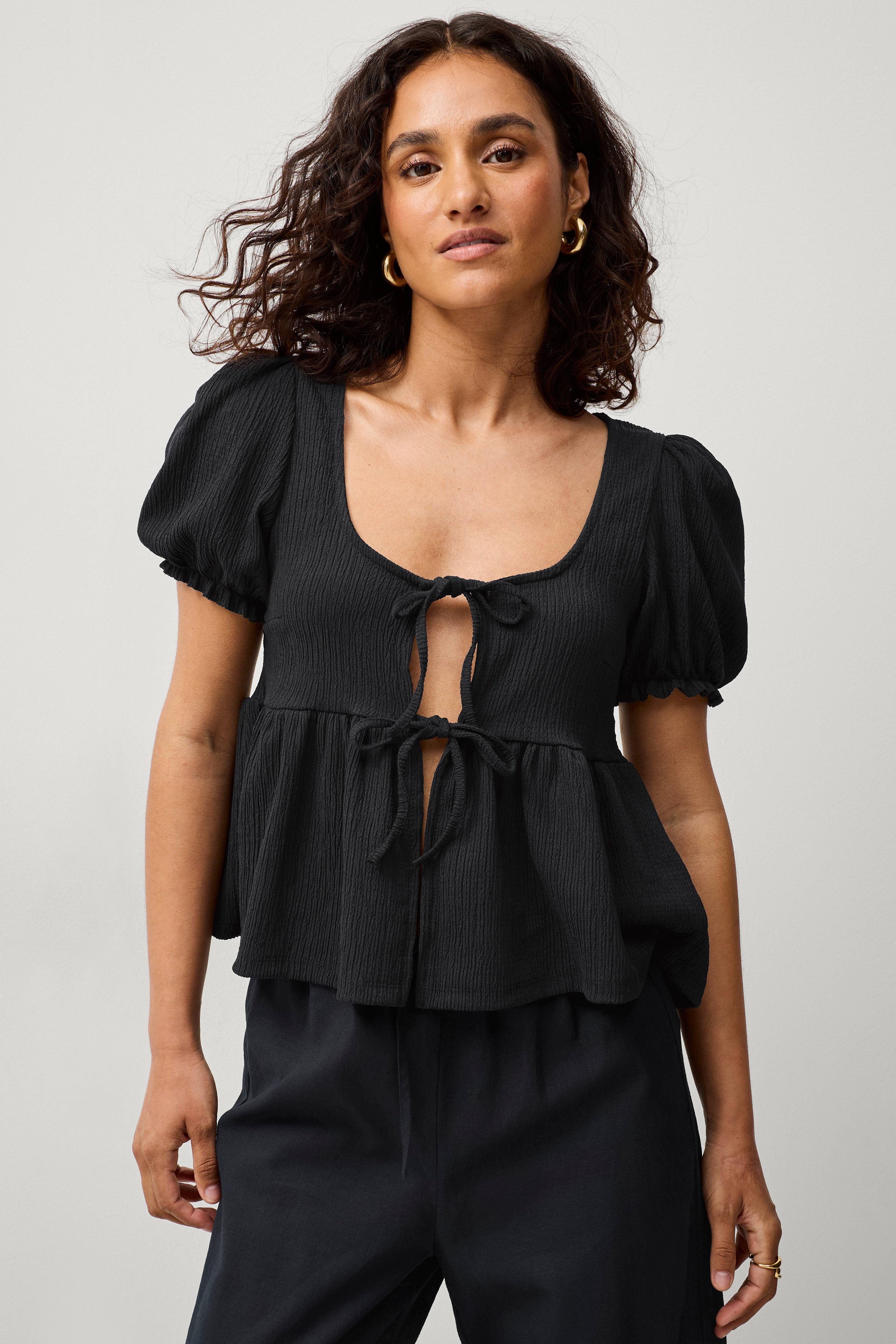 • Figurformede model• Bred halsudskæring• Åbning foran med to bindebånd• Kort ballonærme med elastiksøm nederst