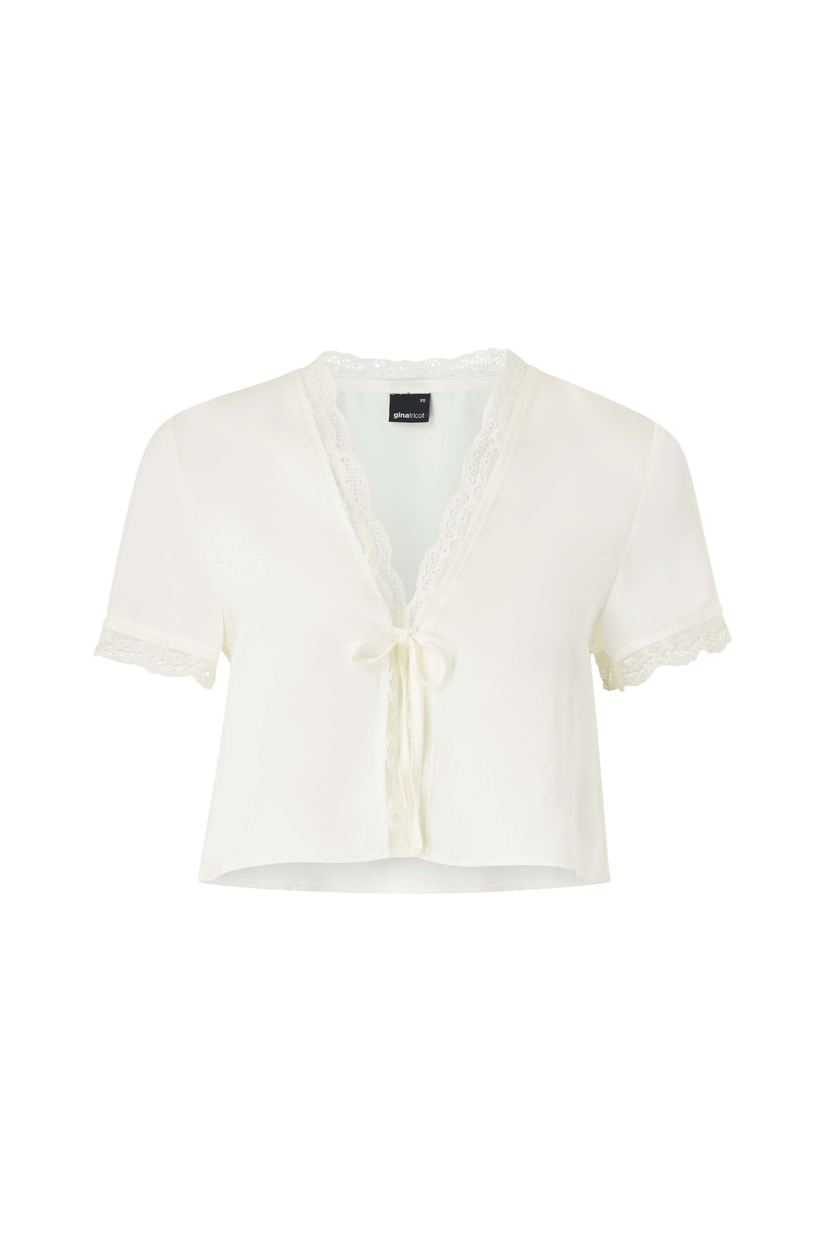• Kort, lige model i satin• Bindebånd midt foran• Kort ærme med blonde ved ærmeafslutningerne• Blonde i halsen og langs forkanten