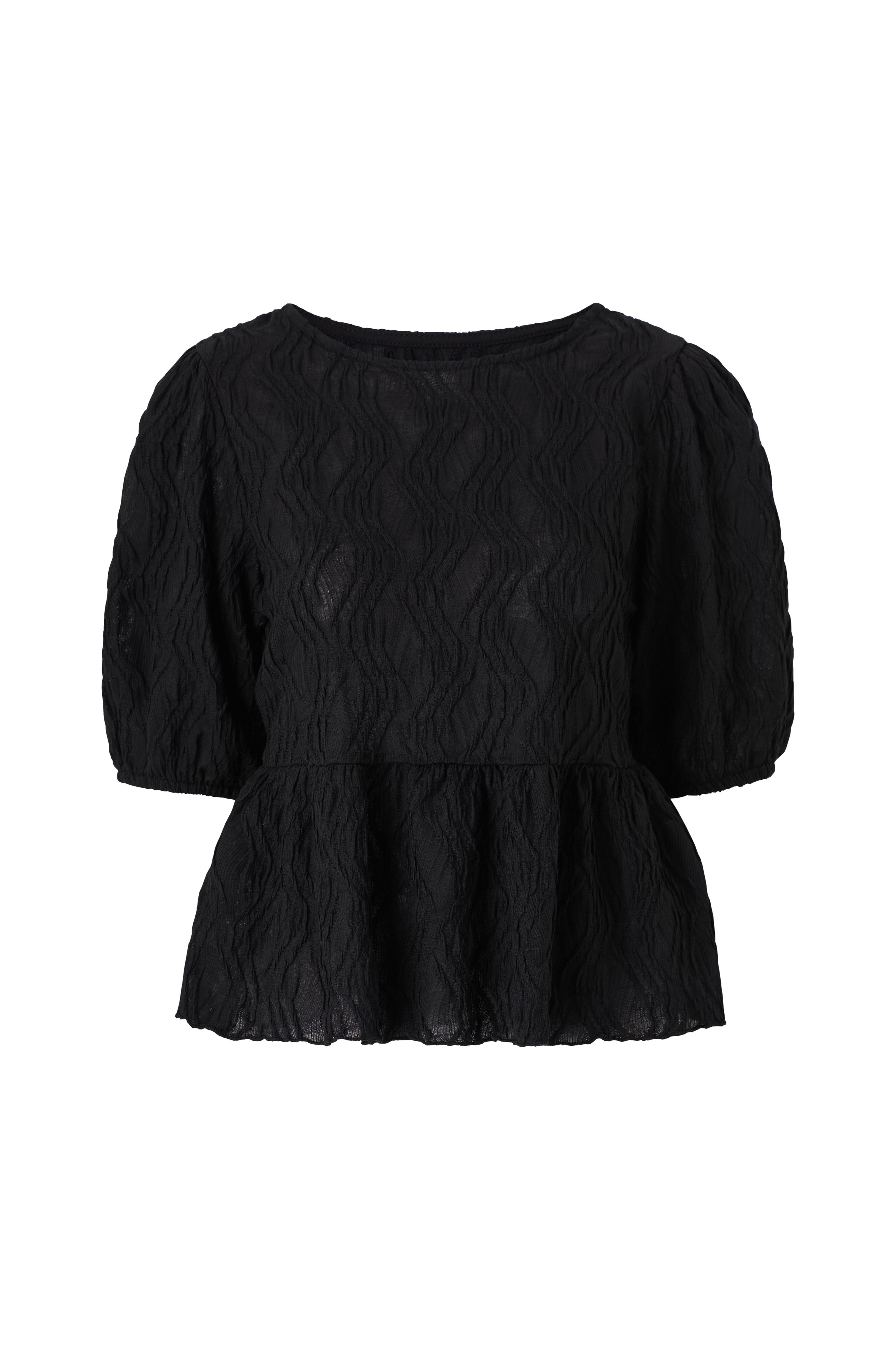 • Let figurformet model• Rund hals med dyb udskæring i ryggen og bredt bindebånd i nakken• Kort ballonærme med elastik ved manchetterne• Rynket talje med vidde nederst