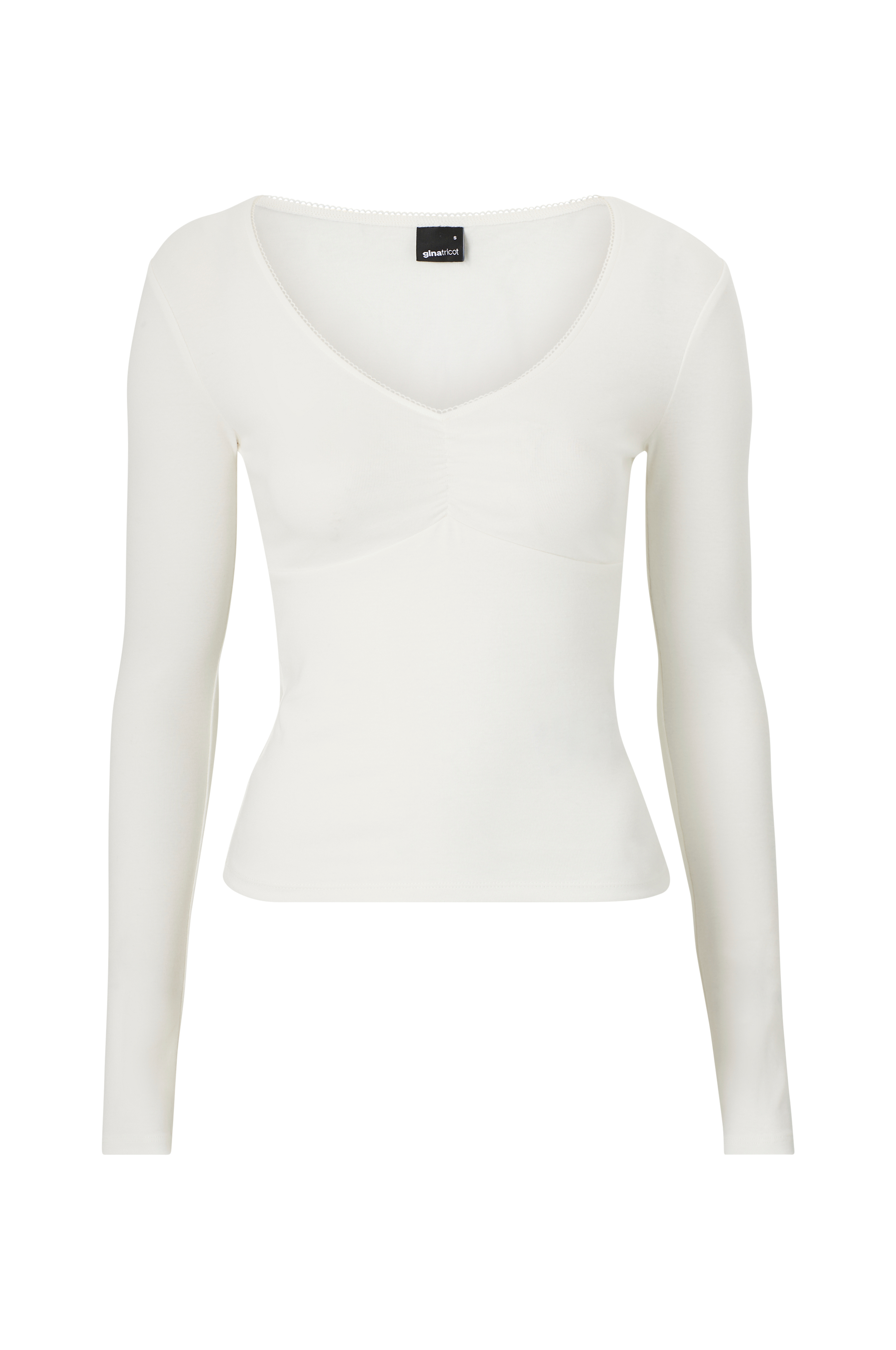 • Figursyet model• V-formet halsudskæring med lille blondekant• Elastisk drapering på brystet• Ekstra langt ærme