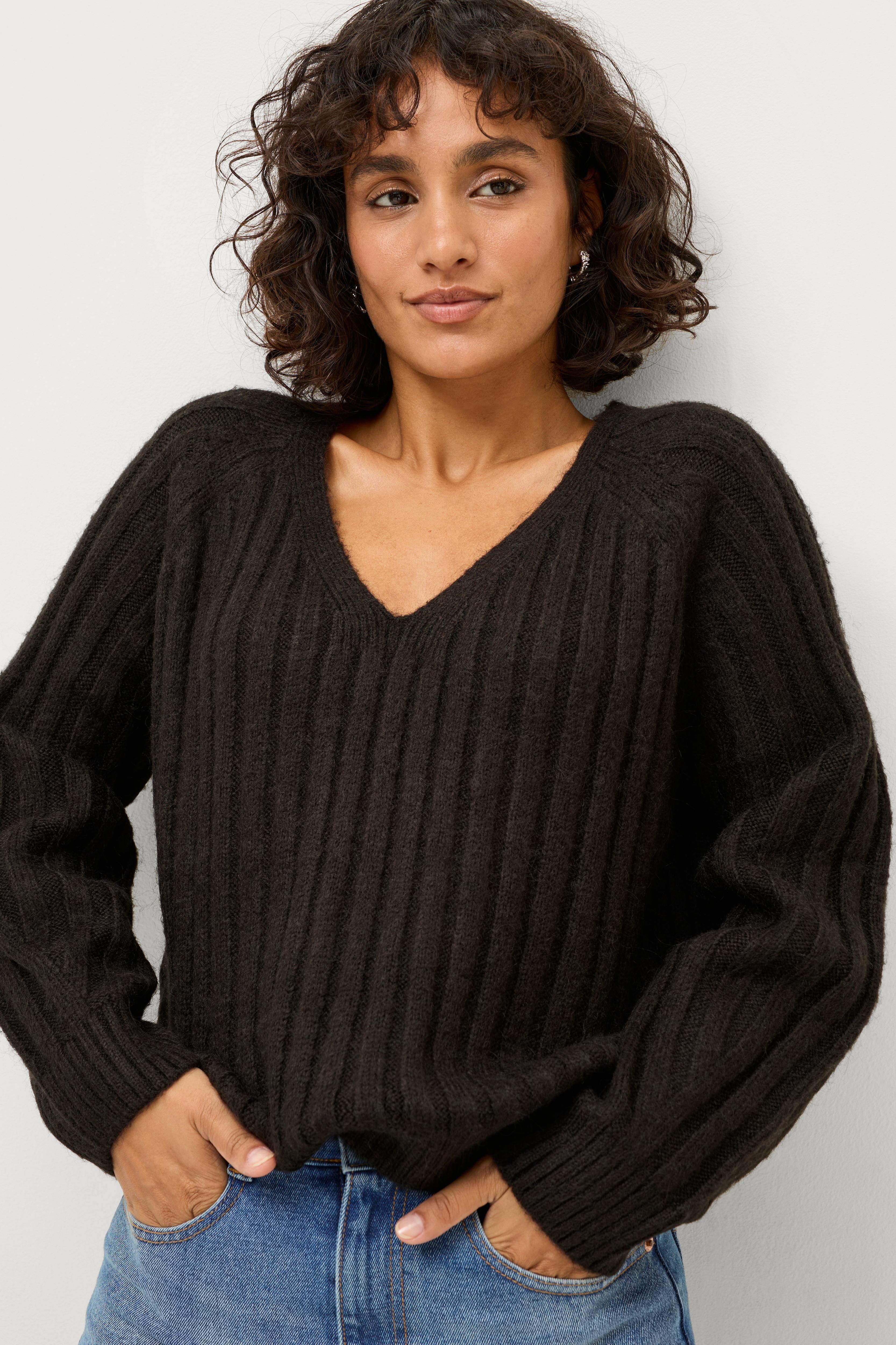 • Ribstrikket trøje• V-udskæring• Raglanærmer