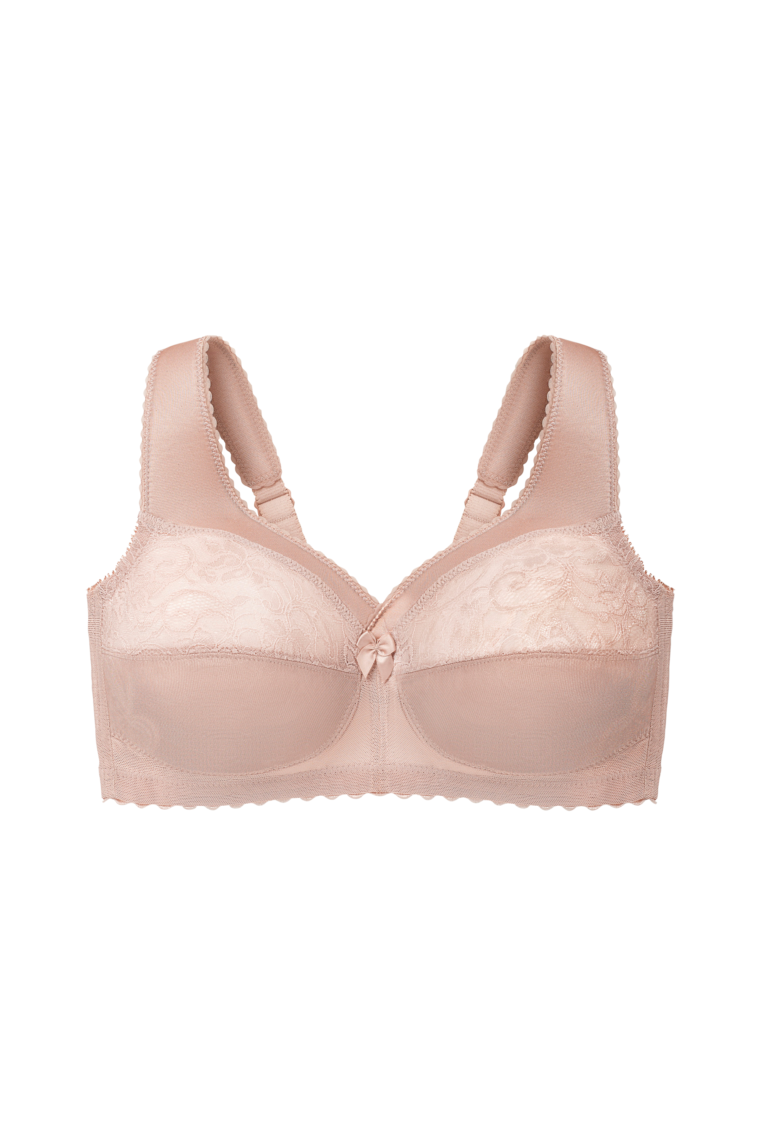 Bøjleløst design med let vattering forneden i skålen for fint løft og støtte hele dagen. Transparent blonde foroven på skålen og lille sløjfe foran. Vatterede skulderstropper for komfort. Bred hægte- og mallelukning bagpå.