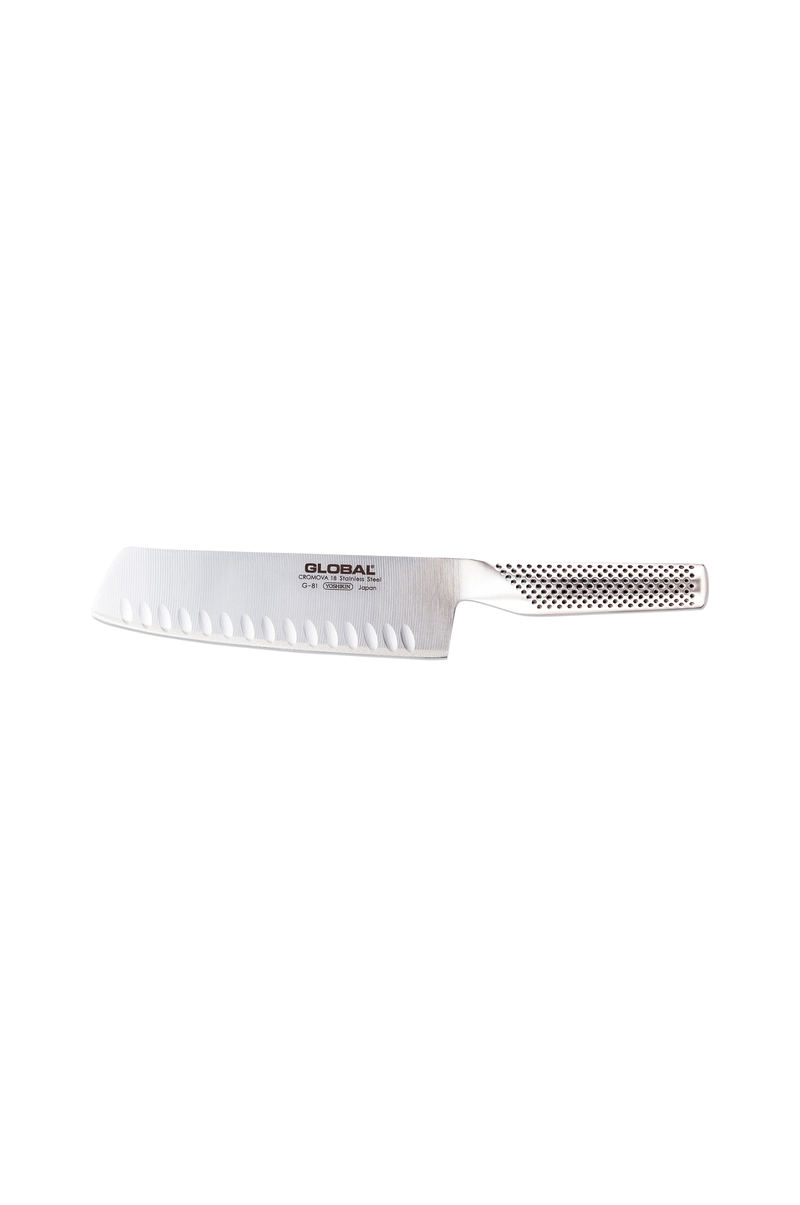Grøntsagskniven er en effektiv kniv. Knivbladet er næsten rektangulært, hvilket gør, at du kan skære hele vejen igennem råvaren uden at skubbe eller trække i kniven. Knivmodellen er perfekt, når du skal have god kontrol over din udskæring, f.eks. ved intensiv hakning eller når du vil undgå at skære i roden af et løg eller rodfrugt. Denne model er olivenslebet, hvilket betyder, at den har små fordybninger i klingen. Det betyder, at råvaren ikke så let klæber til kniven, når du skærer.