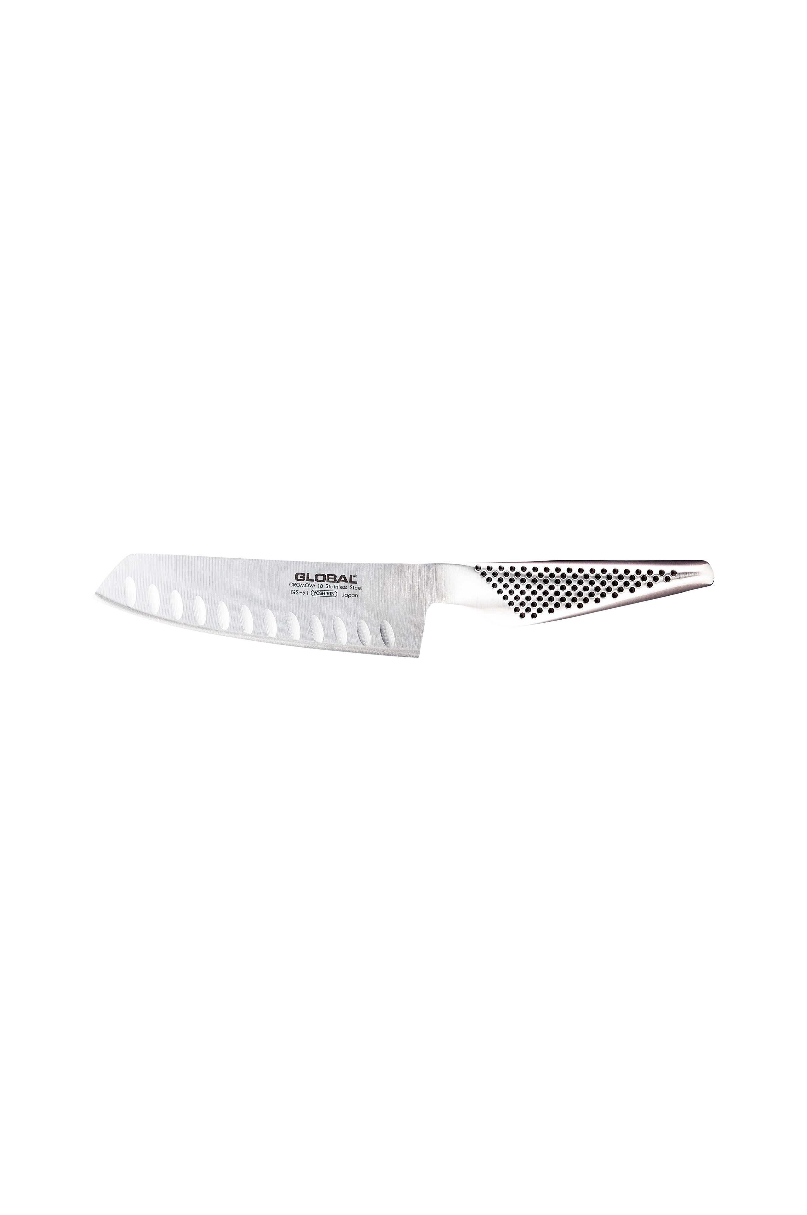 Grøntsagskniven er en effektiv kniv. Knivbladet er næsten rektangulært, hvilket gør, at du kan skære hele vejen igennem råvaren uden at skubbe eller trække i kniven. Knivmodellen er perfekt, når du skal have god kontrol over din udskæring, f.eks. ved intensiv hakning eller når du vil undgå at skære i roden af et løg eller rodfrugt. Denne model er olivenslebet, hvilket betyder, at den har små fordybninger i klingen. Det betyder, at råvaren ikke så let klæber til kniven, når du skærer.