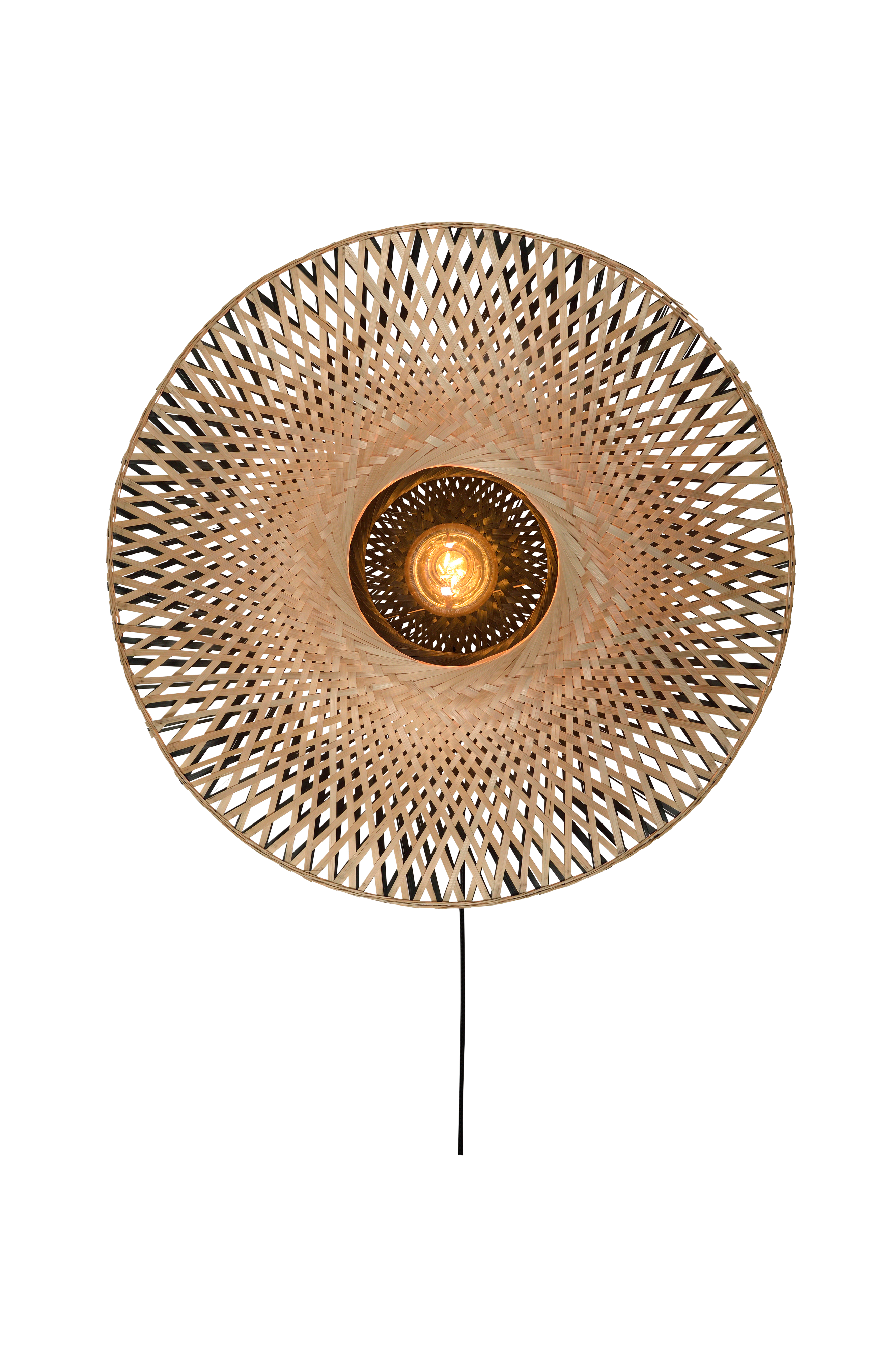 Væglampe Kalimantan. Fatning af jern og skærm håndlavet i bambus. Diameter 60 cm og højde 15 cm. Maks. 60 W og med E27 sokkel. Ledningslængde 2,5 meter. Pære medfølger ikke.