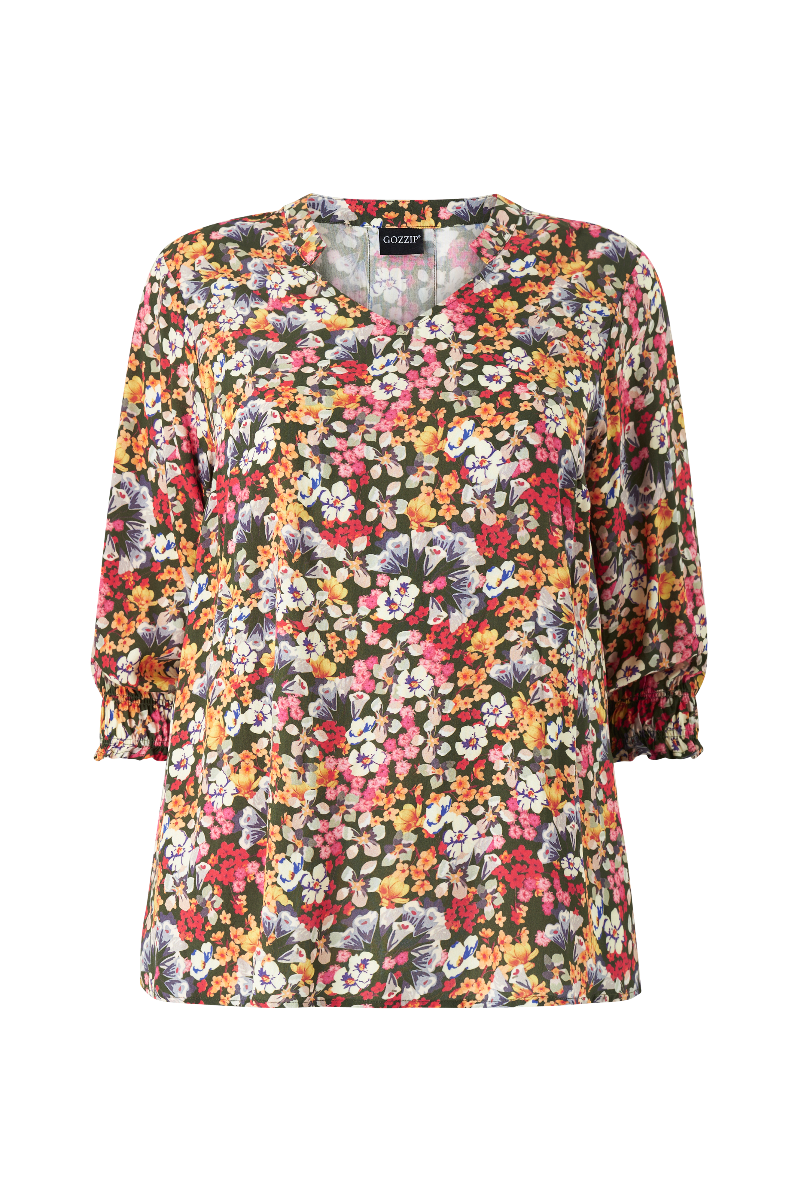 • Bluse i viskose med printet mønster• V-formet halsudskæring• 3/4 lange ærmer med elastisk bånd ved manchetterne• Store størrelser