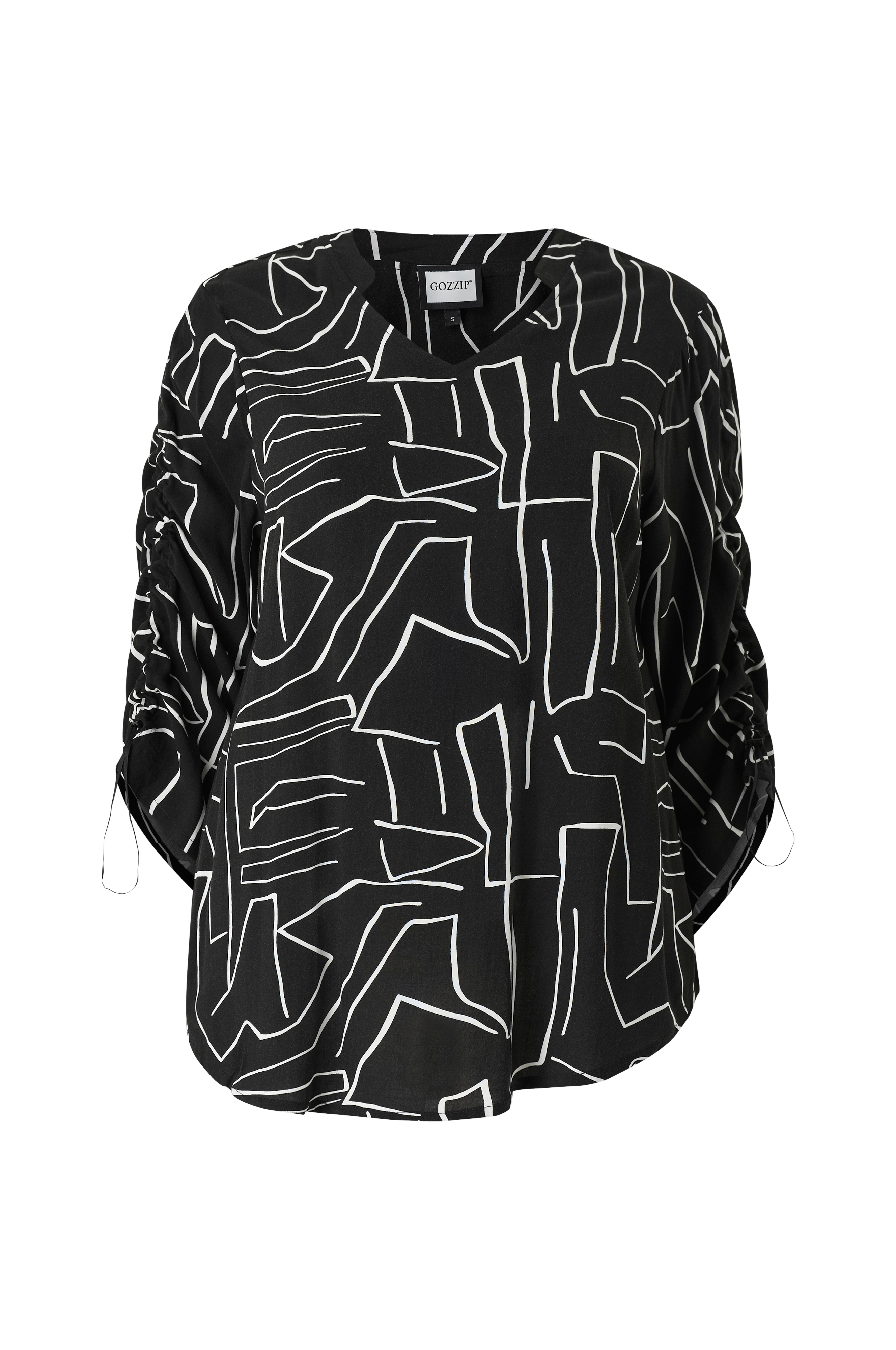 • Mønstret bluse i viskose• V-hals• Træksnørre ved ærmeafslutningerne med Rynkeeffekt langs ærmerne• Noget længere bagside• Store størrelser