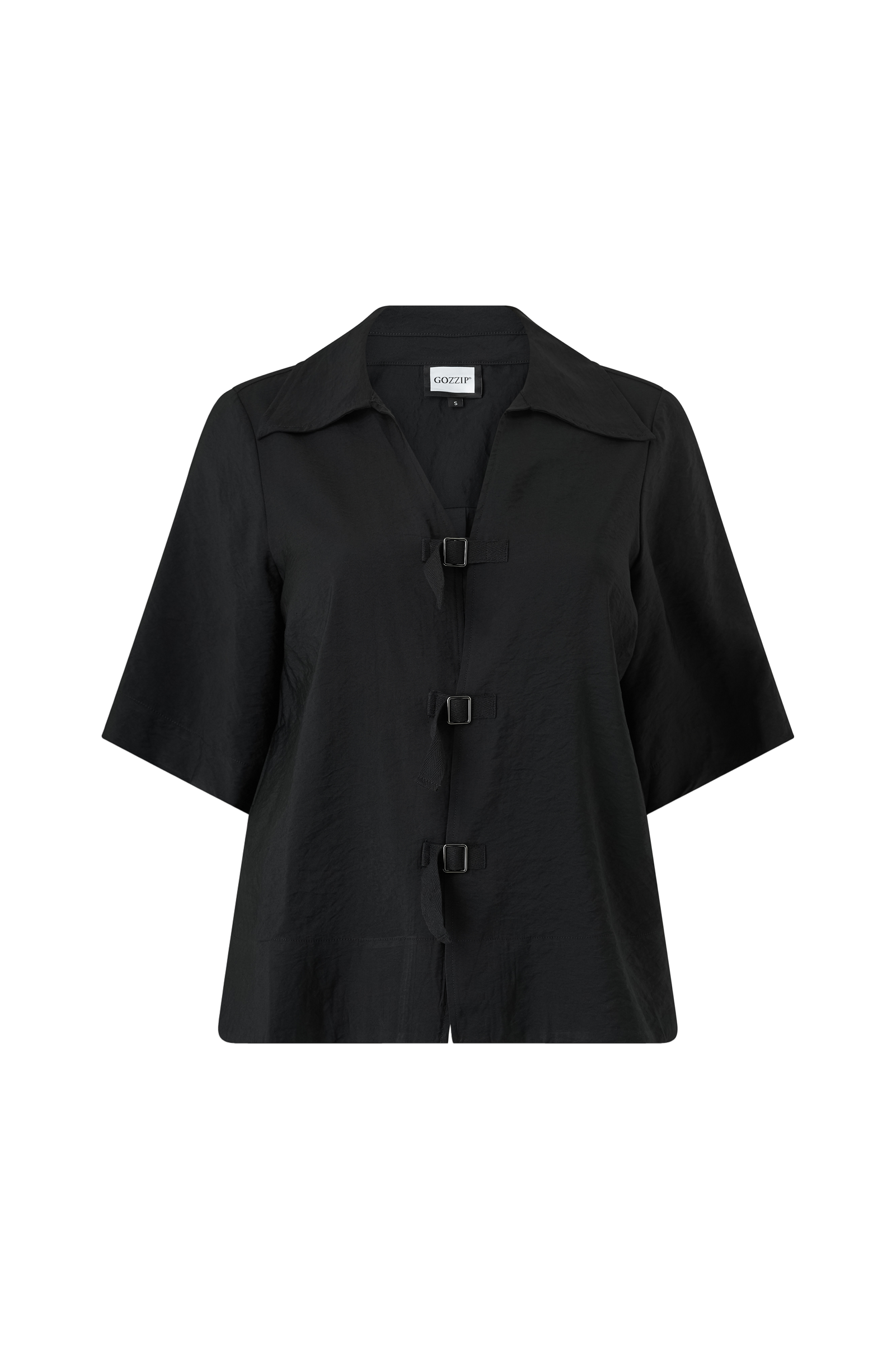 • Bluse i rynket materiale med en krave• Halvlange ærmer• Lukning med remme foran• Slids nede i siderne• Plusstørrelser