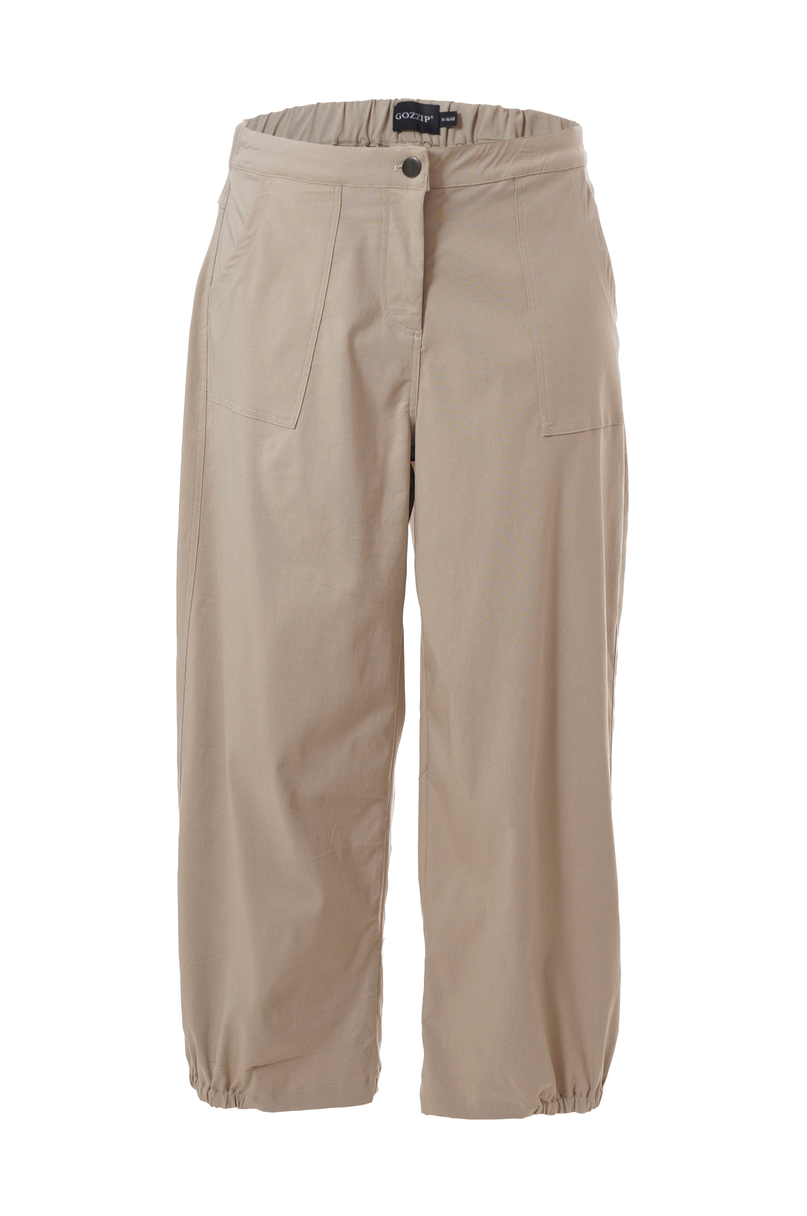 Bukser Baggy Pants fra Gozzip. Skøn model i stretchkvalitet med vide ben som slutter på læggen og har delvist indsat elastik i benkanten. To store, påsyede lommer foran og to bagpå samt linning som er glat foran med lynlås i gylpen og indsat elastik bagpå. Indvendig benlængde ca. 64 cm i str. 44.