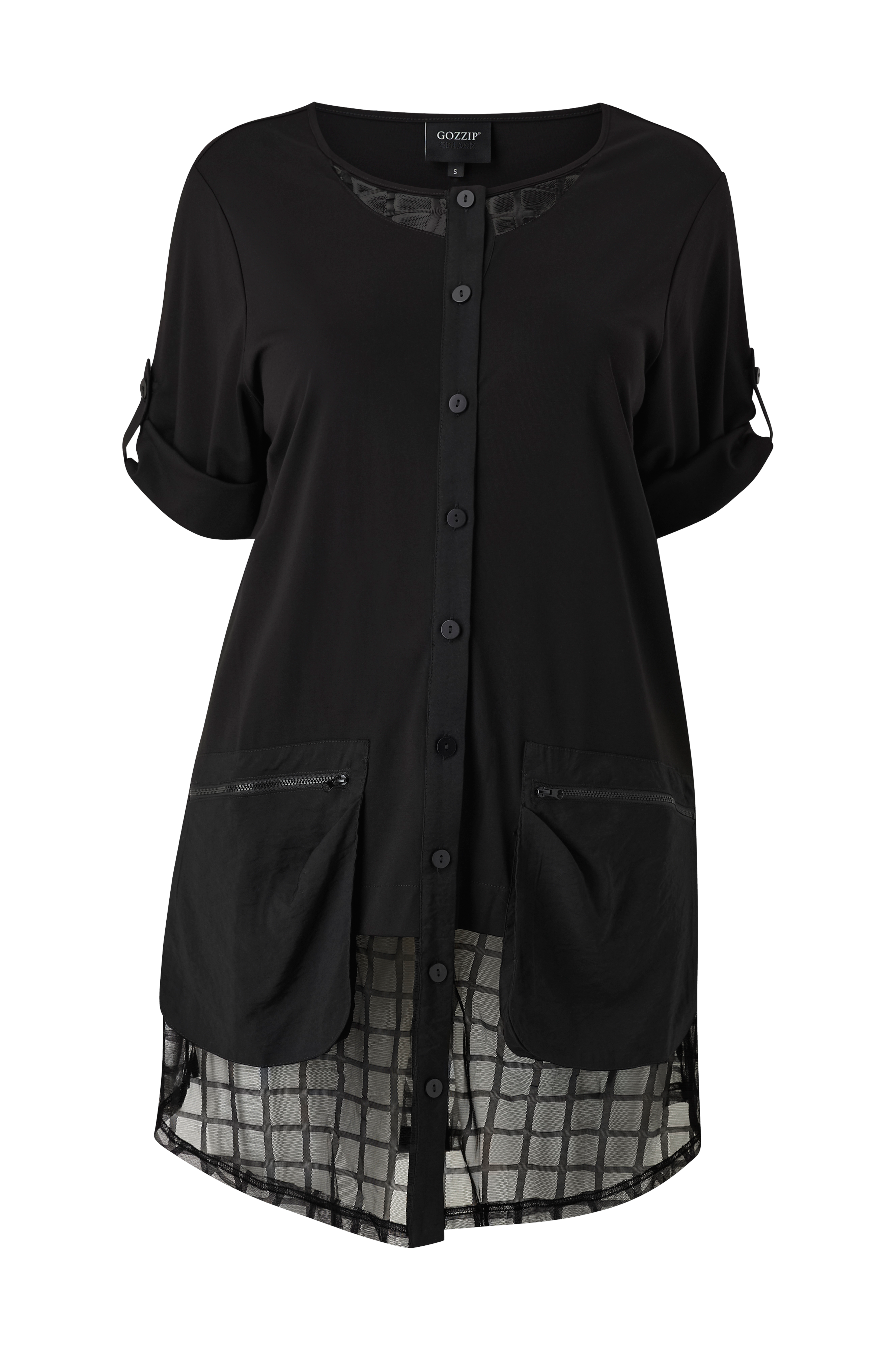 • Cardigan i jersey med knapper• 3/4 lange ærmer med strop og knap• Påsyede lommer med lynlås• Transparent mesh nederst og i halsen• Store størrelser