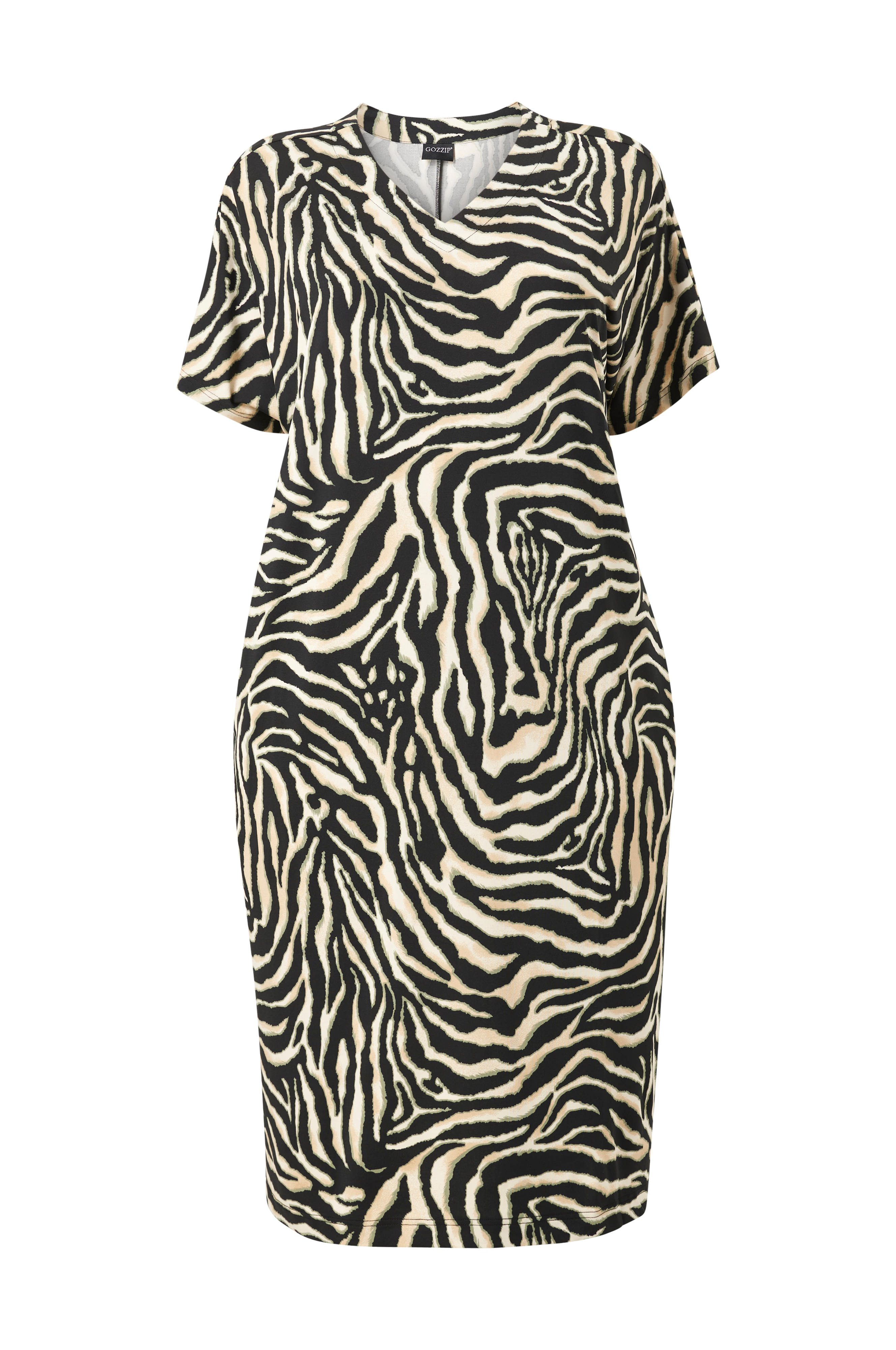 • Mønstret kjole i jersey• Oversize model• V-udskæring• Korte ærmer• Lommer i siderne• Store størrelser• Længde: 117 cm i størrelse S