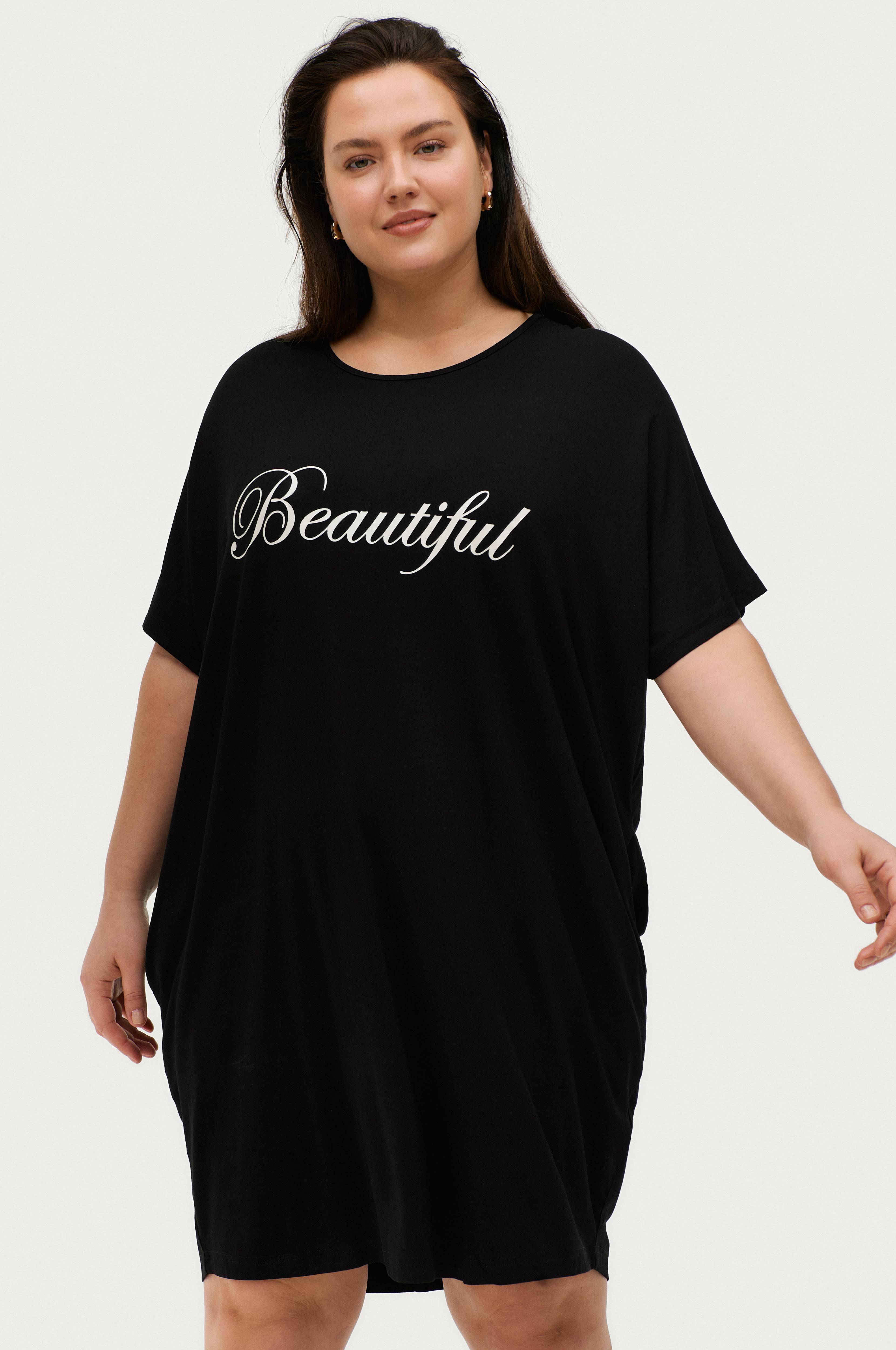 • Vidde på toppen• Indsnævrende pasform• Korte ærmer• Tekstudskrift foran• Lommer i siderne• Fremstillet af blød viskosejersey• Store størrelser• Længde: 101 cm i størrelse S