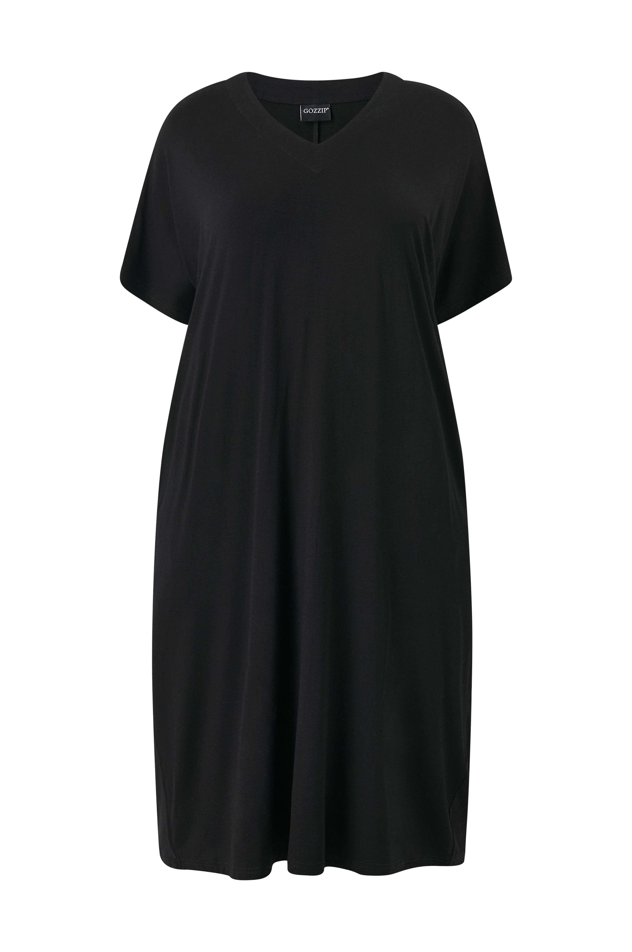 • Kjole i viskosejersey• Vidde på toppen• V-udskæring• Korte ærmer• Lommer i siderne• Store størrelser• Længde: 116 cm i størrelse S