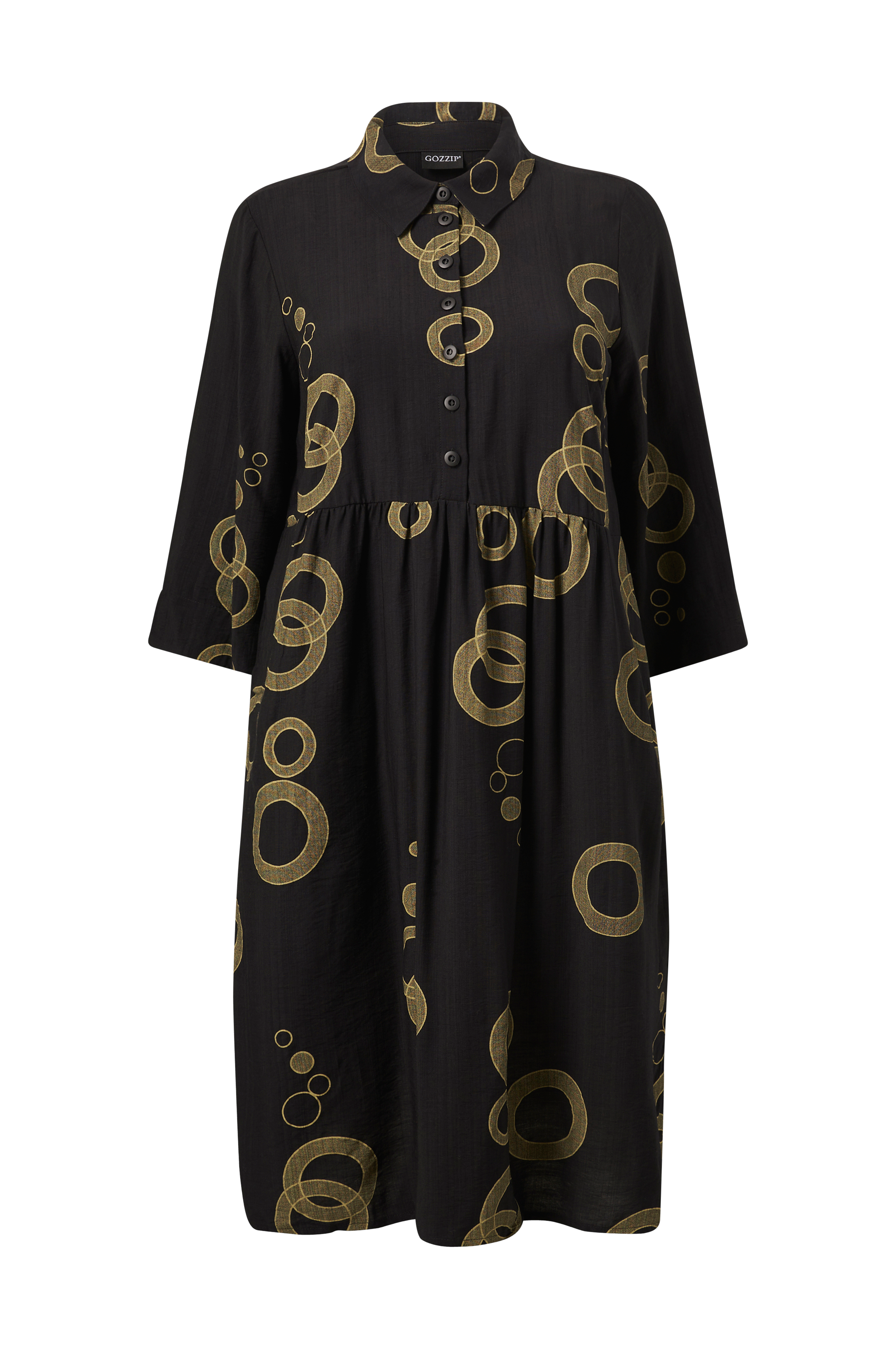 • Knapper oppe foran• Brede ærmer• Rynket talje• Slidser i siderne• Store størrelser• Længde: 125 cm i størrelse S
