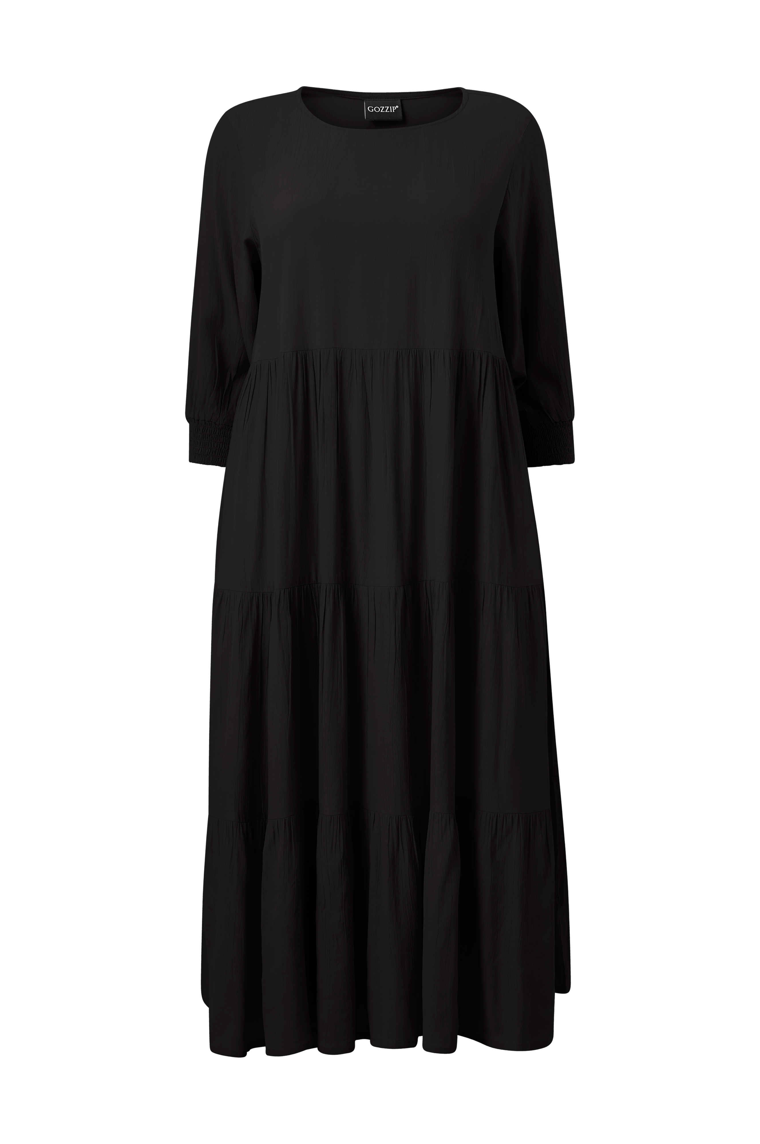 • Lang model med svaj• 3/4 lange ærmer• Rynket talje• Lommer i siderne• Store størrelser• Længde: 131 cm i størrelse S