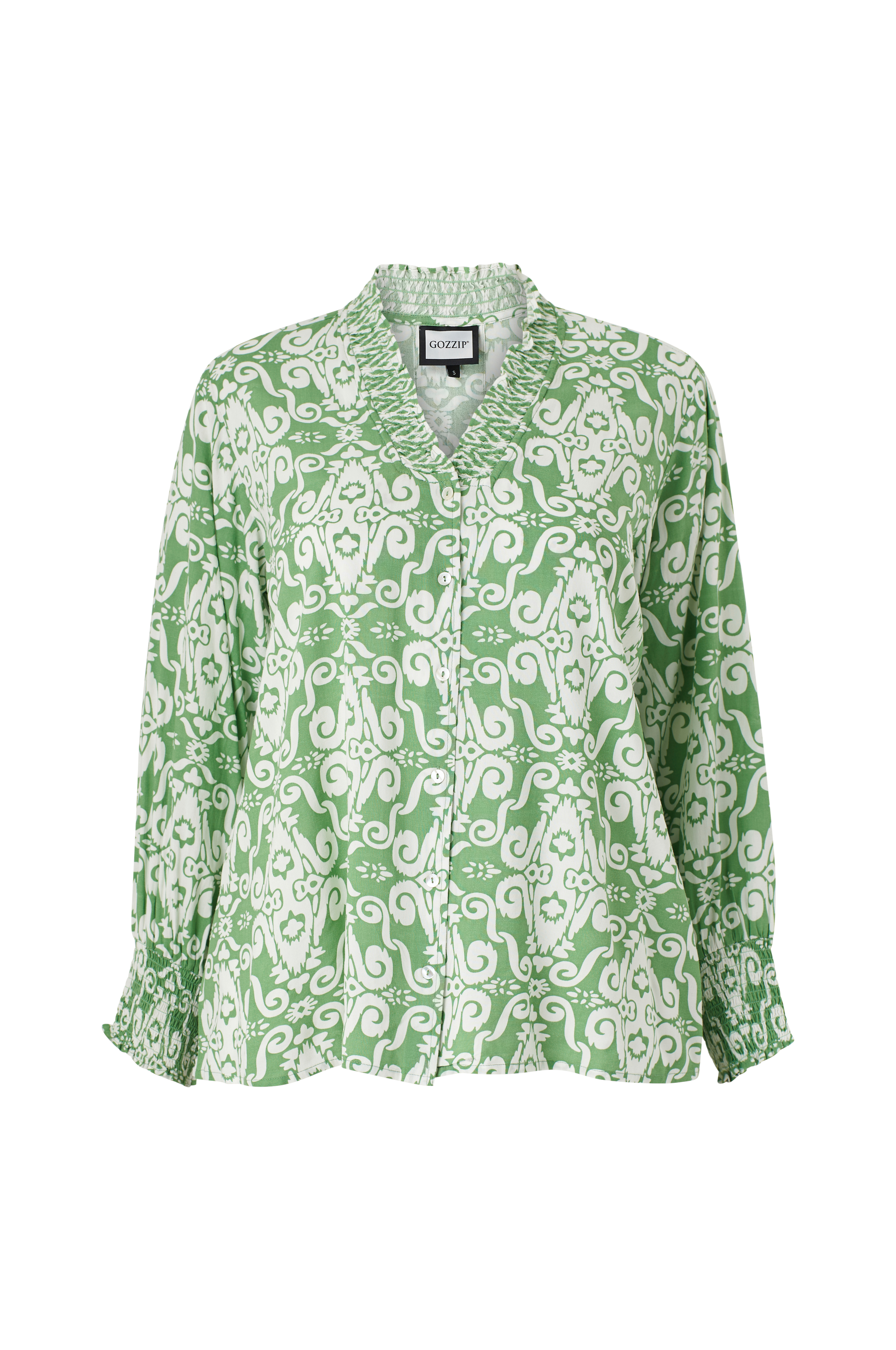 • Mønstret skjorte i viskose• V-udskæring med smock• Knapper foran• Smock ved manchetterne• Store størrelser