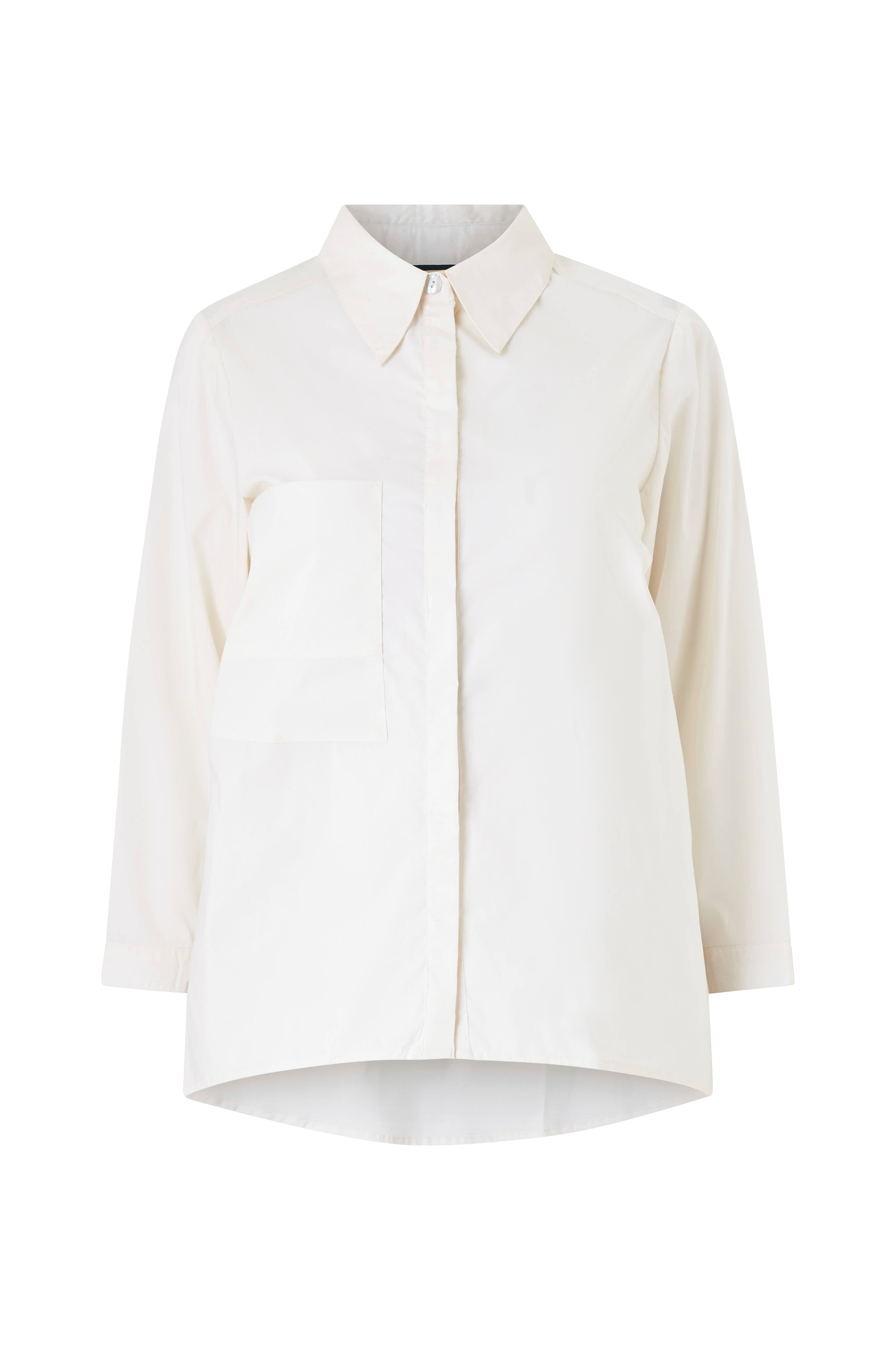 • Store størrelser• Lige oversize model• Krave med lange spidser• Skjulte knapper foran• En stor brystlomme• Langt ærme med manchet• Afrundet søm med længere bagside