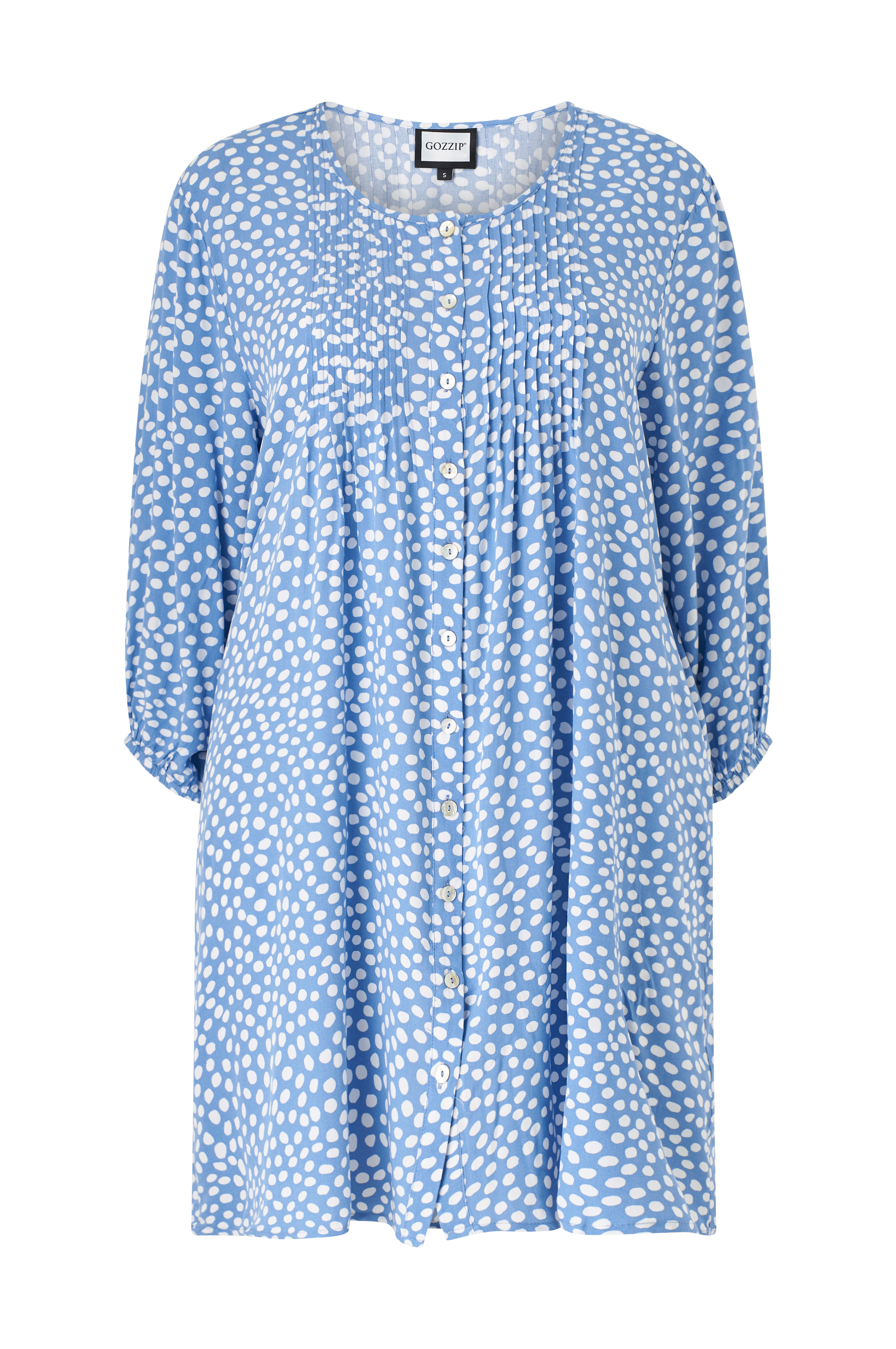 • Store størrelser• Bred model i blød viskose• Rund hals• Syede biselæg på brystet• Knapper hele vejen frem• Langt ærme med elastik ved manchetterne• Indlagte sidelommer• Længde: 98 cm i størrelse S