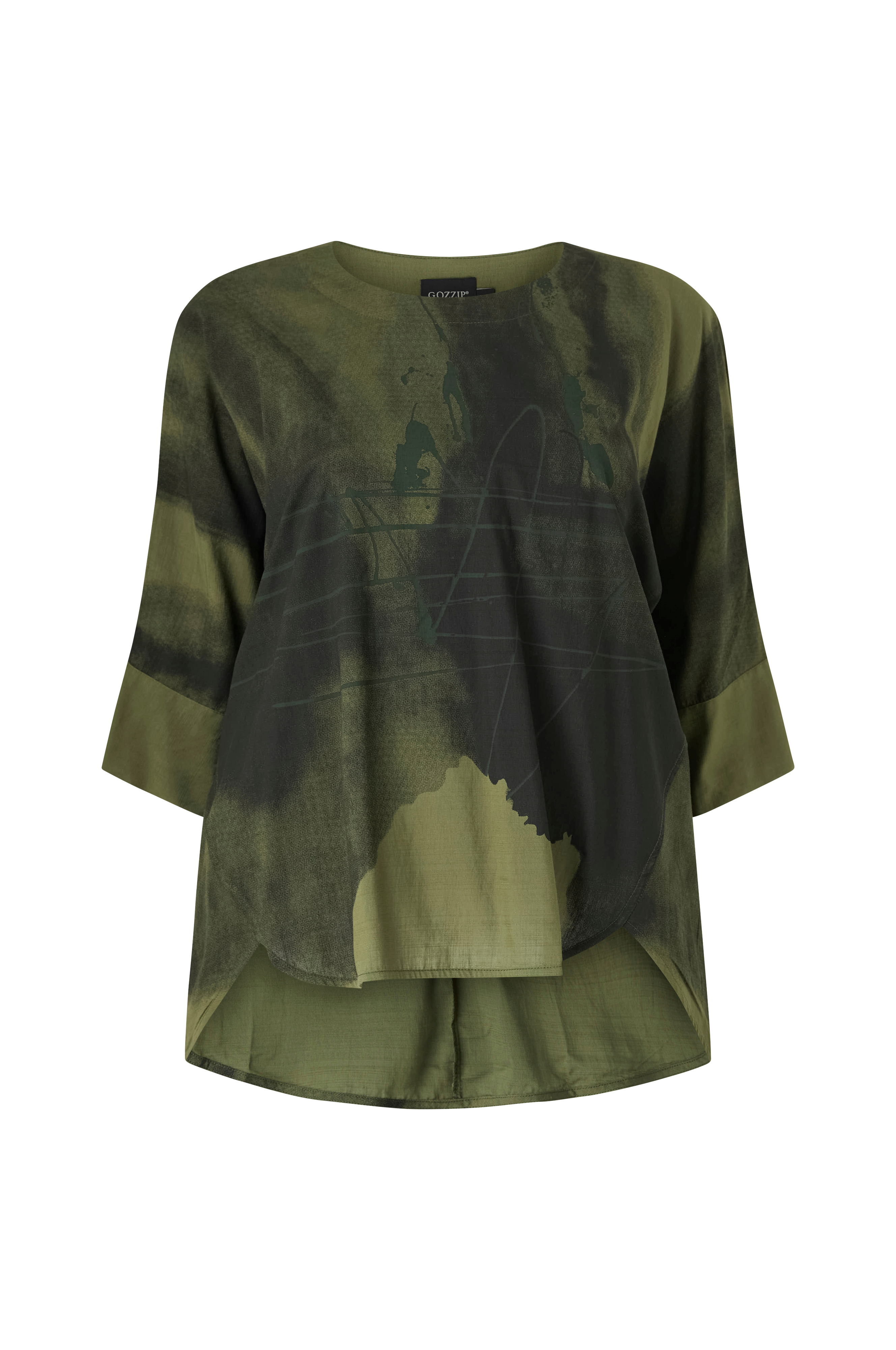 • Store størrelser• Bred oversize model• Rund hals• Bredt, 3/4 langt kimonoærme• Afrundet søm med længere bagside