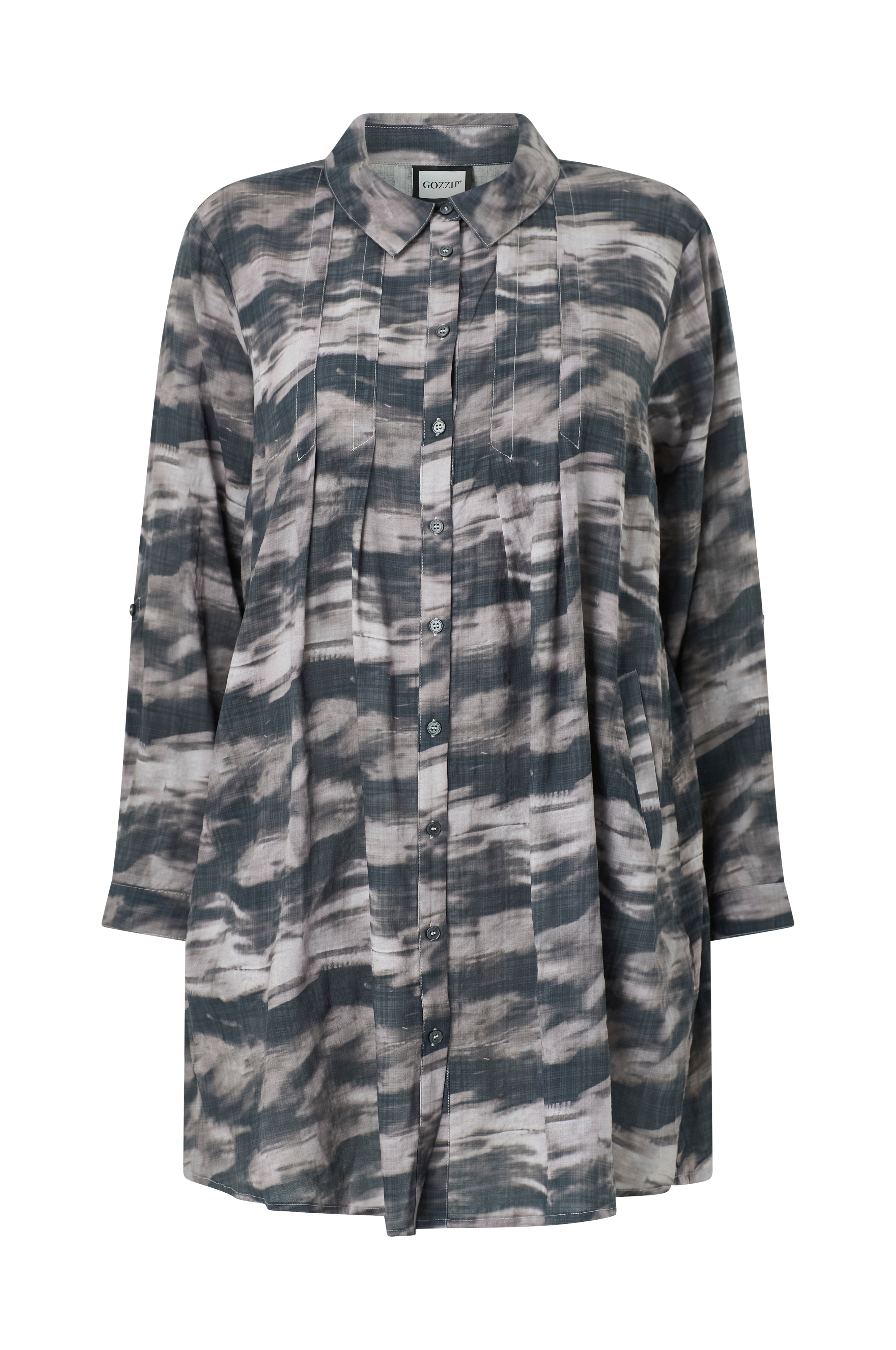 • Mønstret tunika• Krave• Lange, opfoldende ærmer• Manchetter• Knaplukning• Dekorative folder foran og bagpå• Plusstørrelser• Længde: 94 cm i størrelse S
