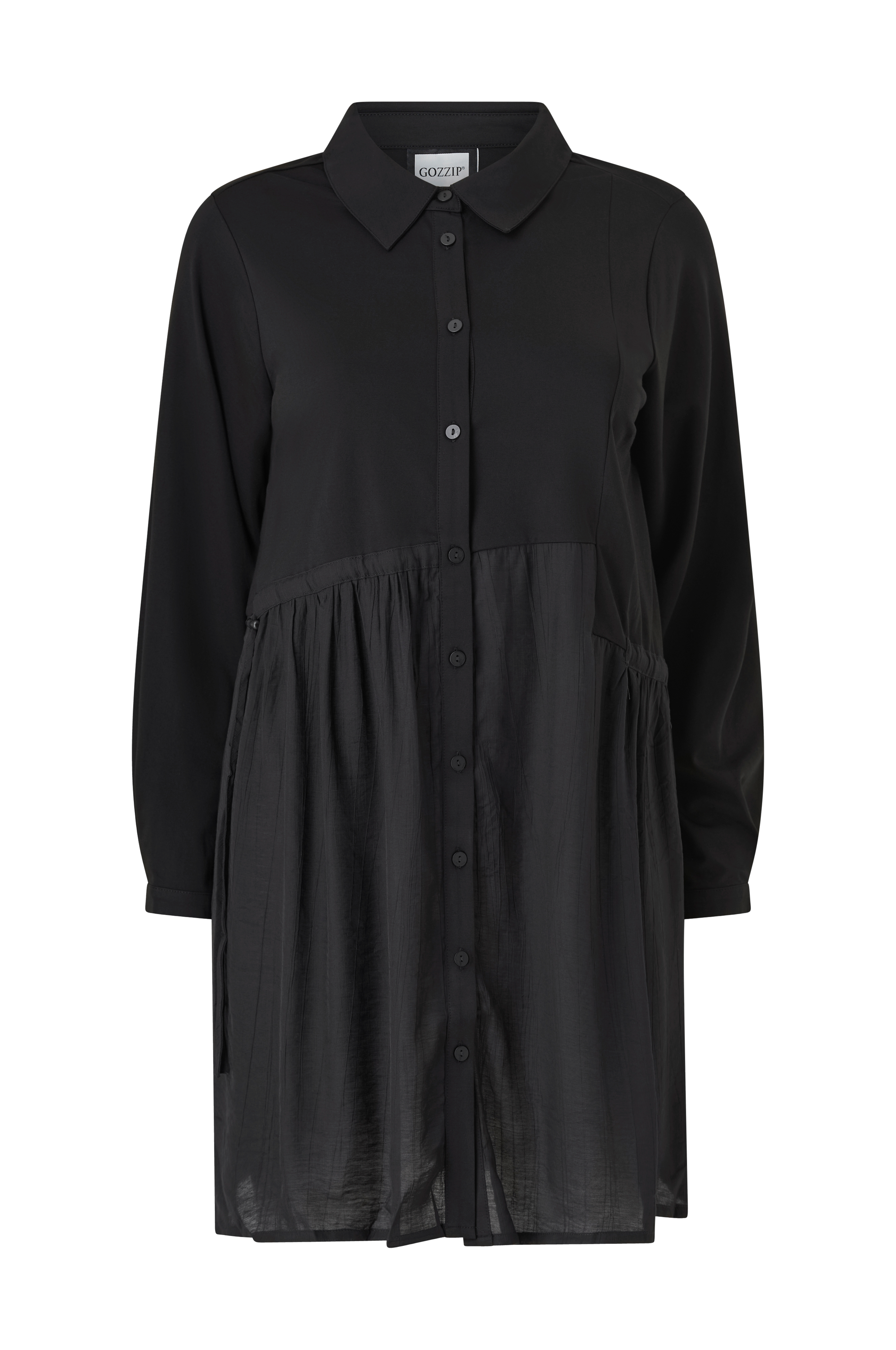 • Tunika med elastisk jersey foran og på ærmerne• Skørt og ryg i vævet kvalitet• Krave• Knapper hele vejen frem• Træksnørre ved taljen• Lange ærmer med knap ved manchetterne• Store størrelser• Længde: 93 cm i størrelse S