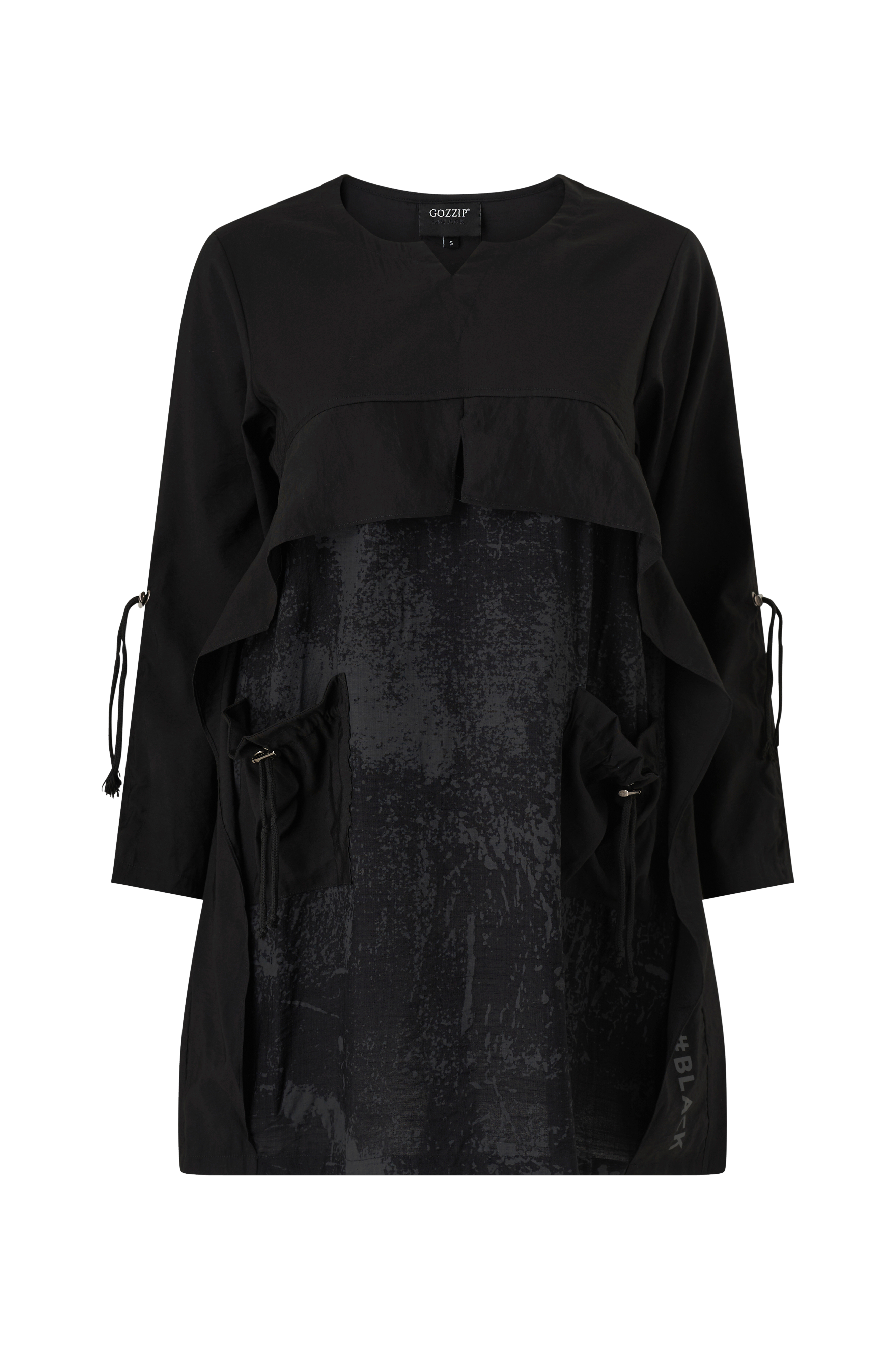 • Store størrelser• Uformel model med svaj• Rund hals• Langt ærme med træksnørre i midten• Rundskåret indlæg på brystet og i siderne• Lommer med træksnørre• Længde: 93 cm i størrelse S