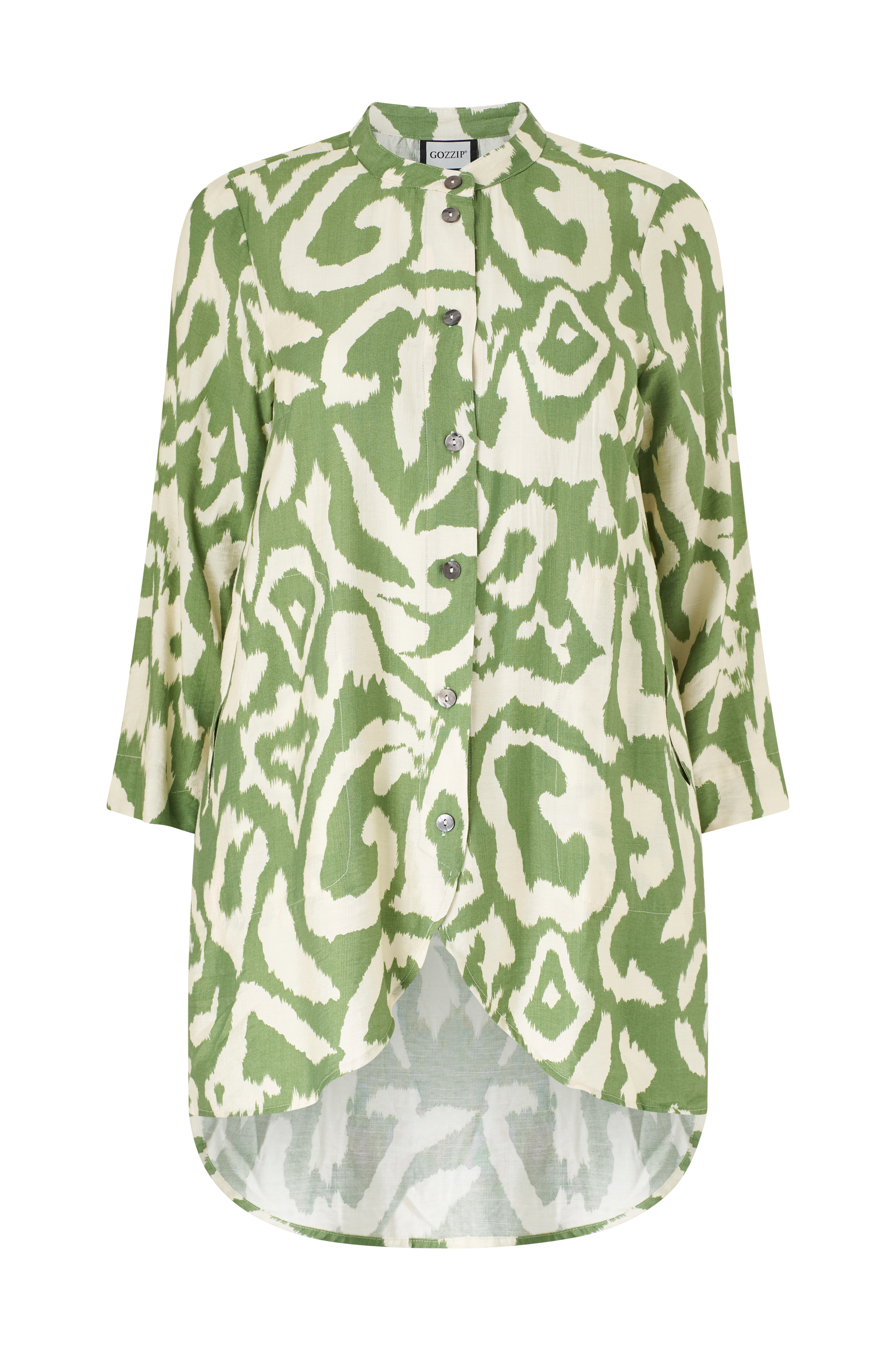 • Store størrelser• Bred, lige model• Rund hals med lille kant• Knapper hele vejen frem• Lige, bredt ærme• Indlagte lommer• Afrundet søm med længere bagside• Længde: 103 cm i størrelse 42/44