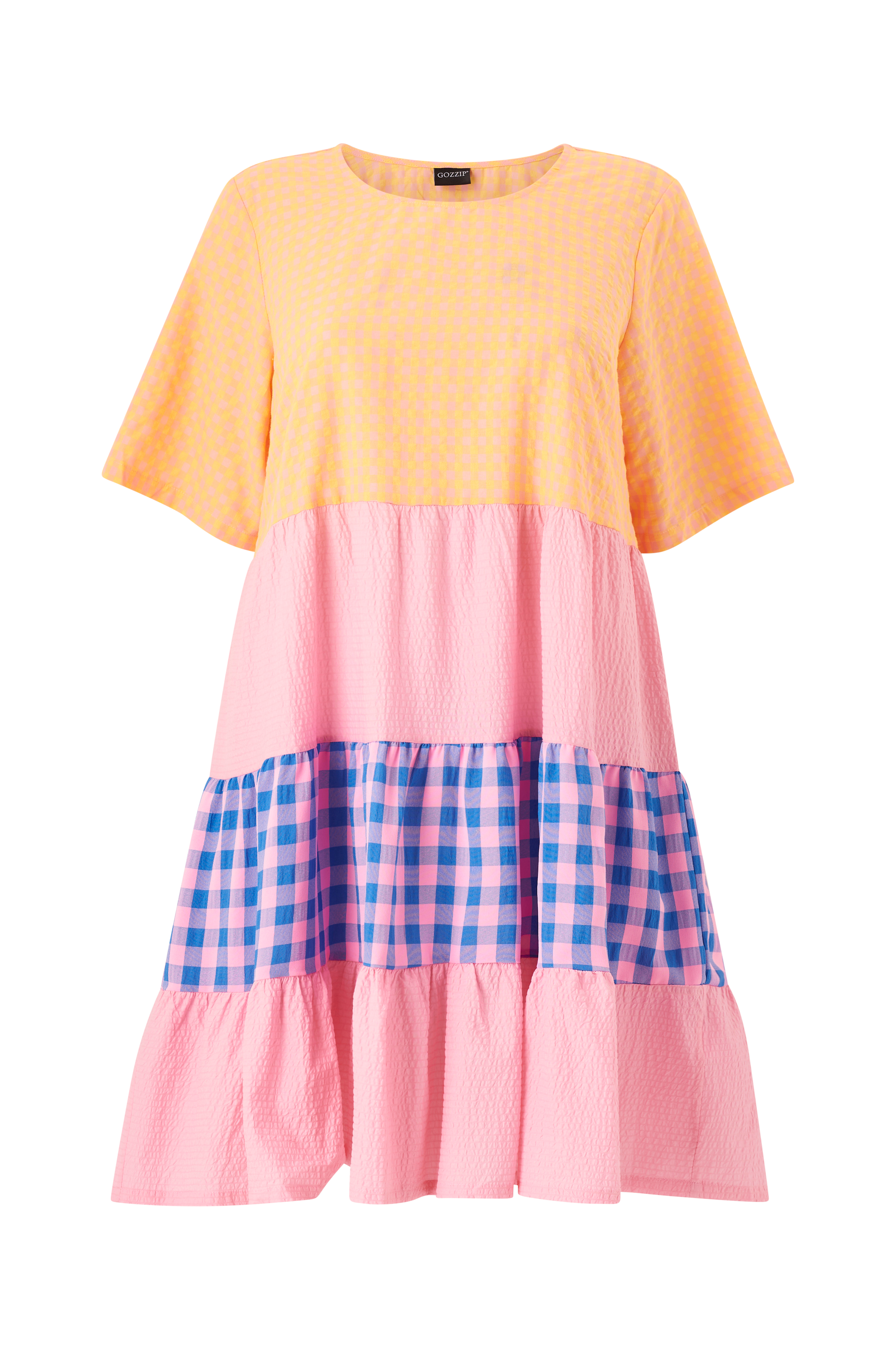 • Model med svaj• Colorblockmønstret• Korte, brede ærmer• Volant nederst• Store størrelser• Længde: 100 cm i størrelse S
