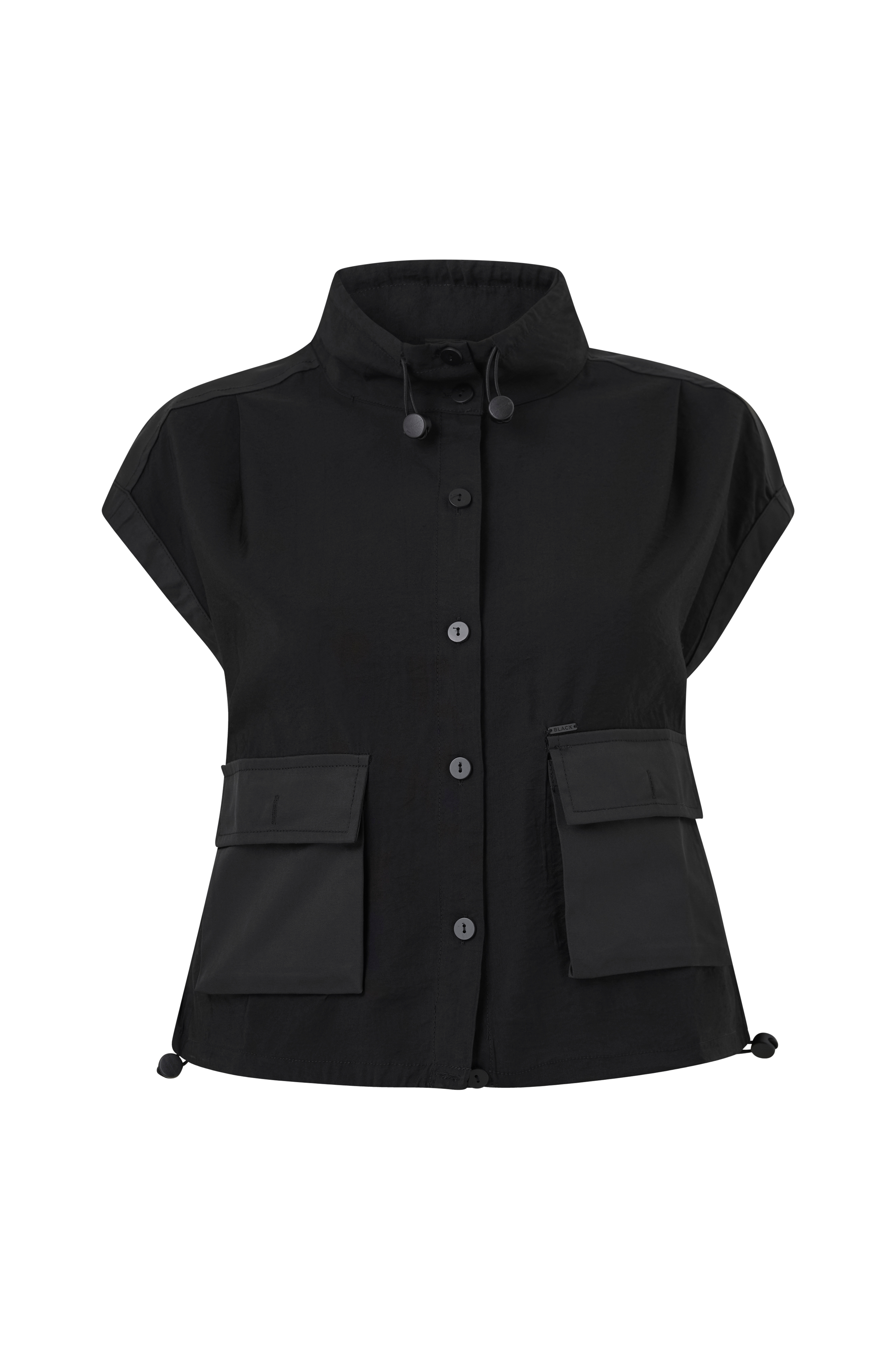 • Vest i let skinnende bomuldsblanding med satinlignende detalje• Korte korte ærmer• Knapstolpe foran med knapper• Høj krave med træksnørre• To lommer foran med låg• Træksnørre ved nederste kant• Store størrelser