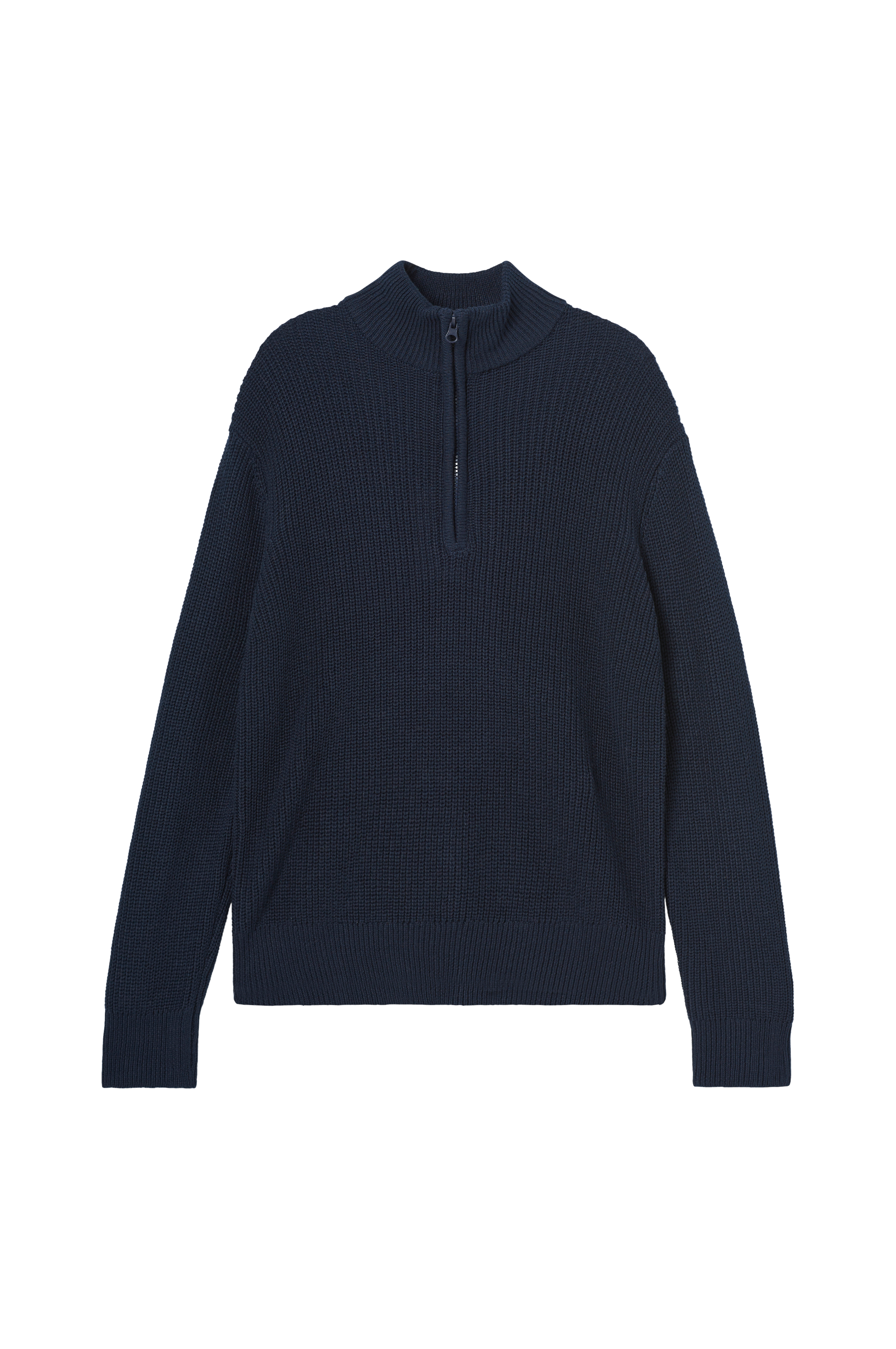 • Strikket trøje• Fremstillet af bomuldsblanding• Høj, ribbet krave• Kort lynlås