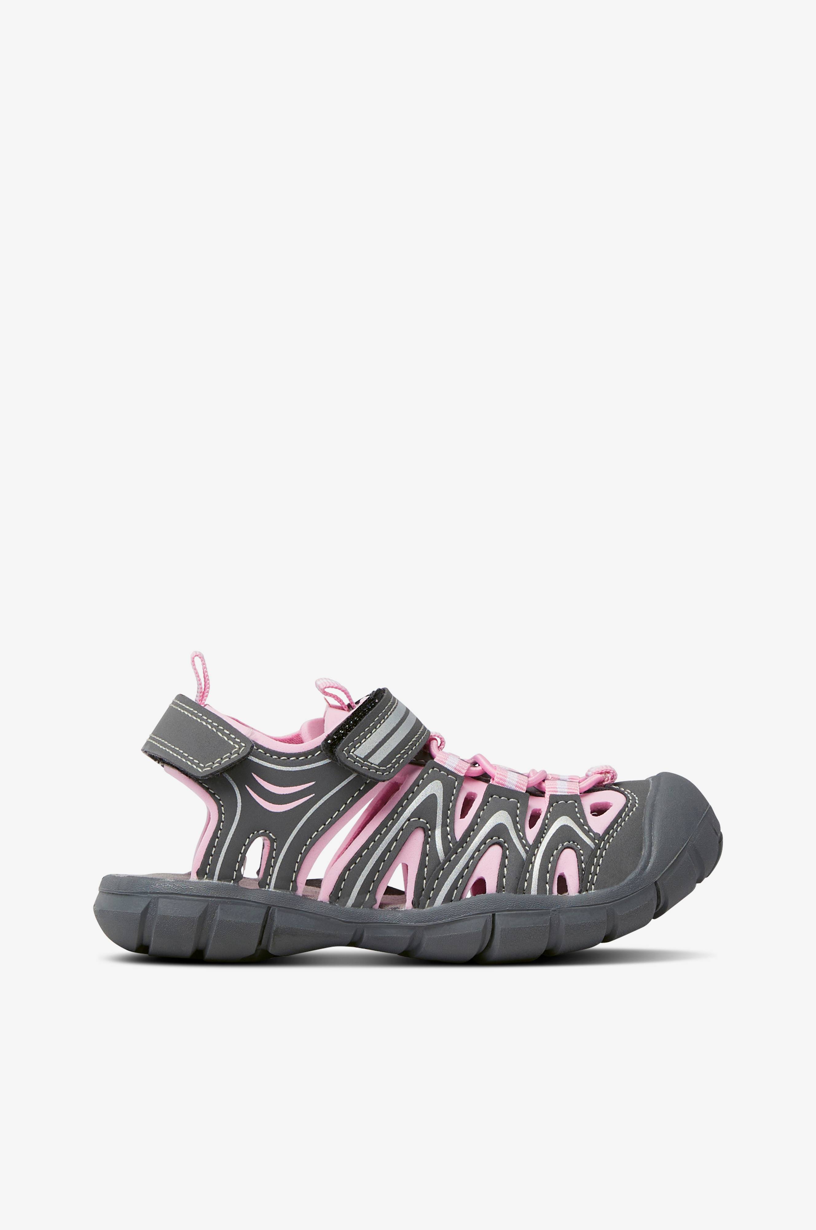 Sporty sandaler med lukket, forstærket tå og overdel i tekstil og syntet. Justerbar velcrorem over foden og bagpå for perfekt pasform. Vævede trækstropper både foran og bagpå. Skridsikker ydersål.
