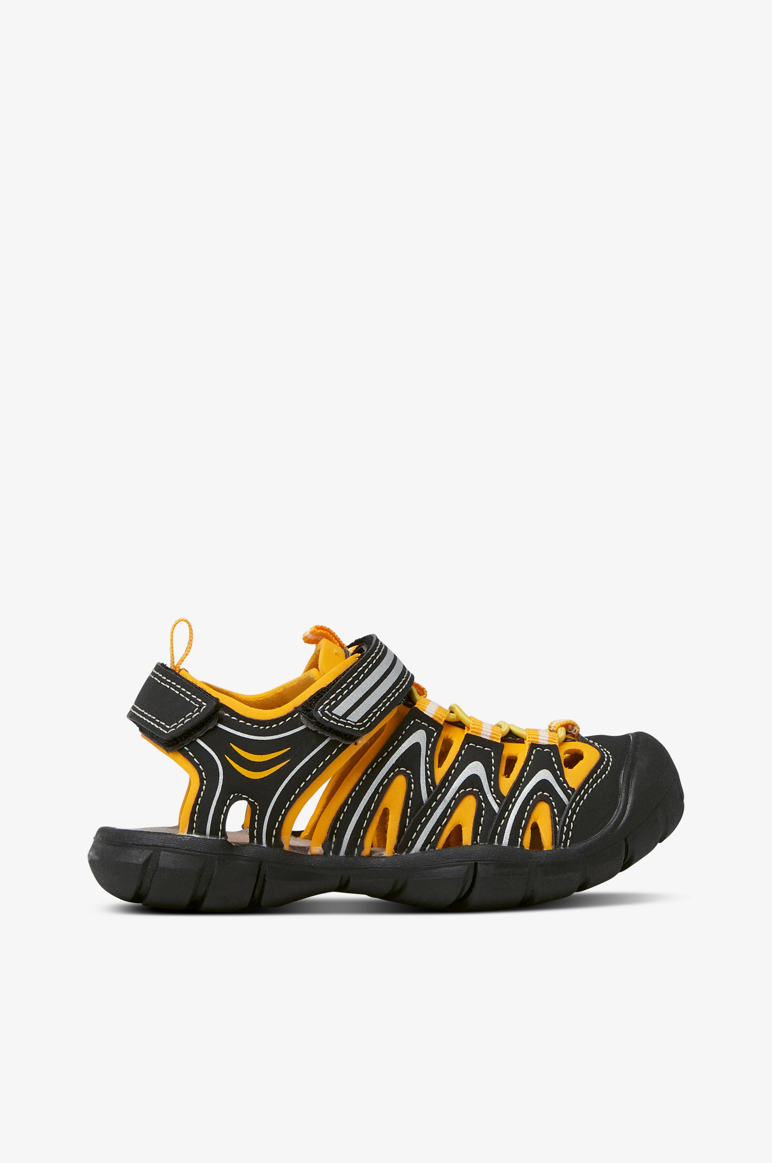 Sporty sandaler med lukket, forstærket tå og overdel i tekstil og syntet. Justerbar velcrorem over foden og bagpå for perfekt pasform. Vævede trækstropper både foran og bagpå. Skridsikker ydersål.