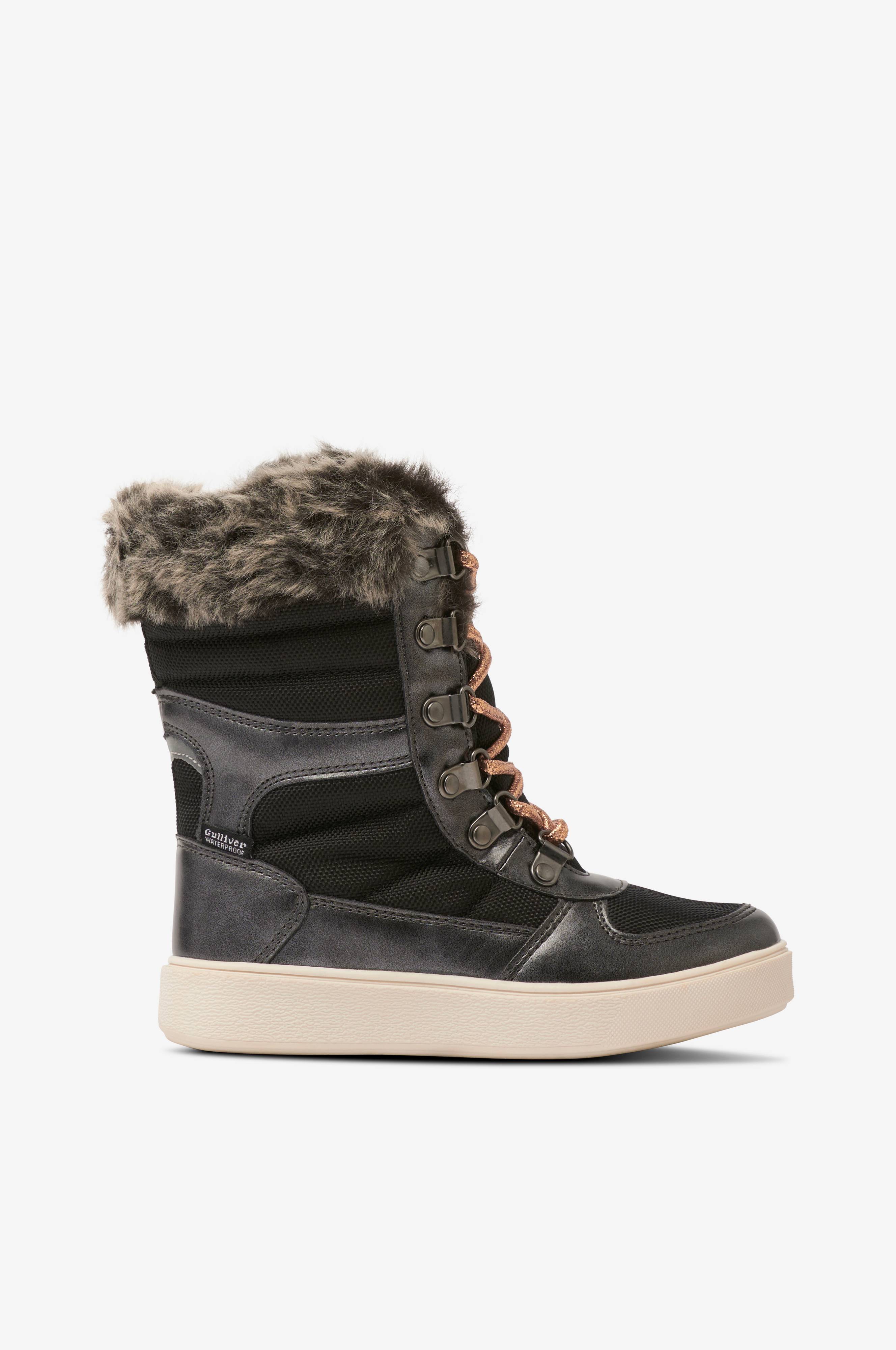 Vandtætte støvler fra Gulliver som er varmforet og har blød kunstpels i skaftet. Støvlesnøring med glitrende snørebånd og lynlås på skaftet som gør det nemmere at tage støvlen af og på. Indersålen kan tages ud. Et par ekstra snørebånd i en anden farve medfølger.