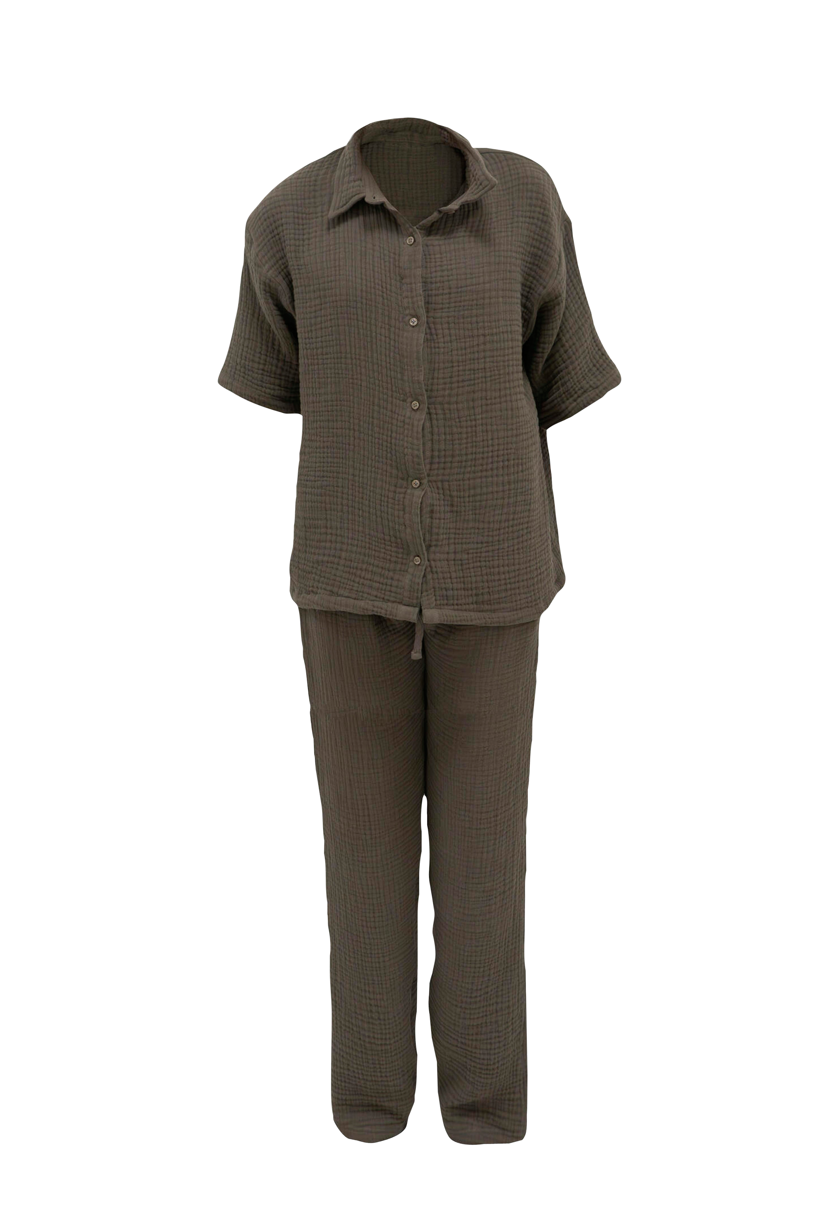 Et behageligt og hyggeligt pyjamassæt fra Gustav Ovland lavet af 100% bomuldsmuslin. Perfekt loungewear til dig, der gerne vil skifte til noget behageligt og luftigt, når du ligger hjemme i sofaen - og samtidig se frisk ud. - 100% bomuldsmuslin, 4 lag - pyjamassæt bestående af bukser og en t-shirt - bukserne har bindebånd i taljen - fås i størrelserne s/m og l/xl - brystlomme på t-shirten og baglomme på bukserne - dette produkt er en del af Gustav Ovlands kollektion, stärkelsesfabriken.