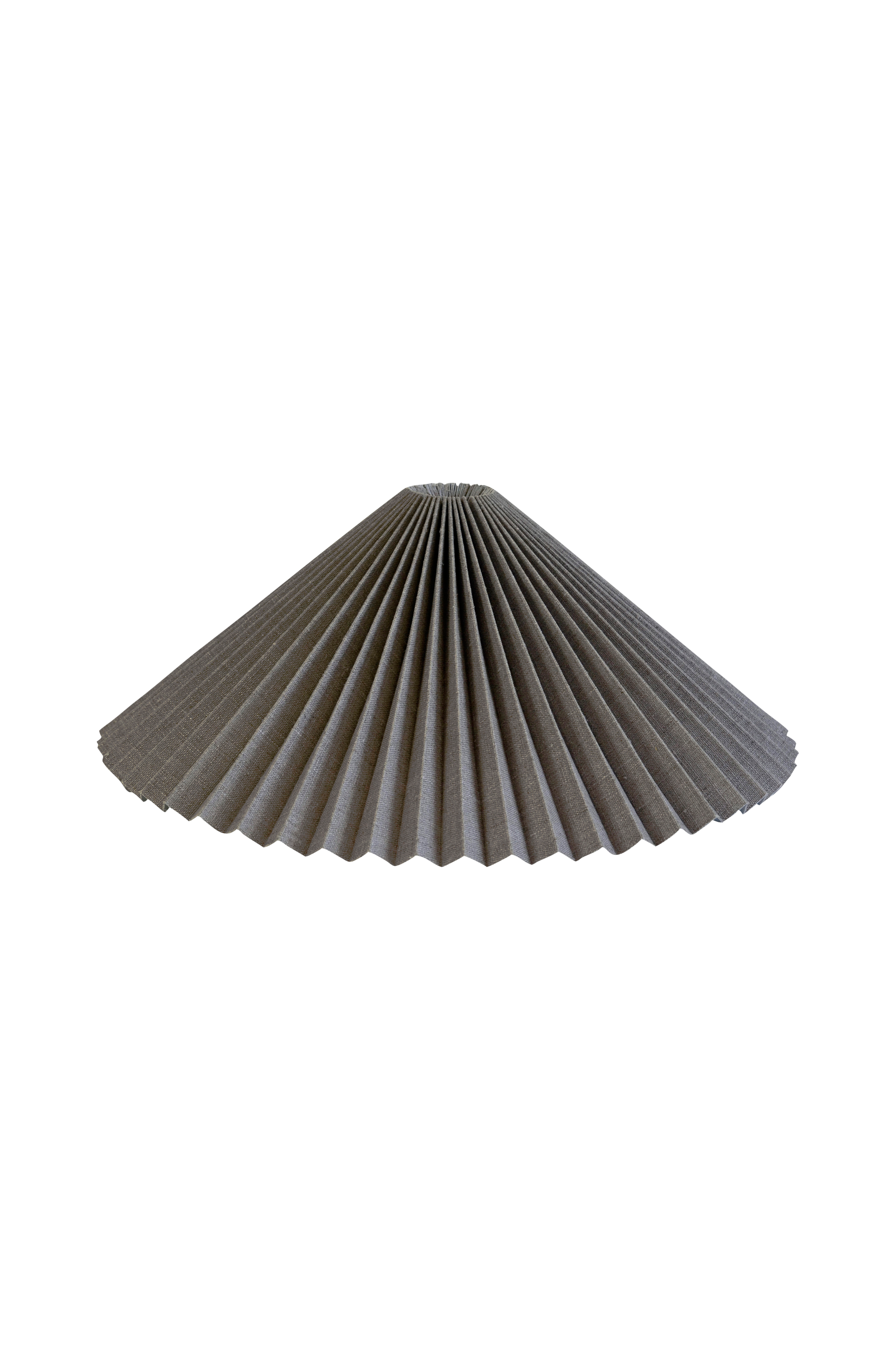 Plisseret lampeskærm i 100% hør. Højde 19,5 cm, bredde forneden 50 cm, bredde foroven 6 cm. E27 bærering.