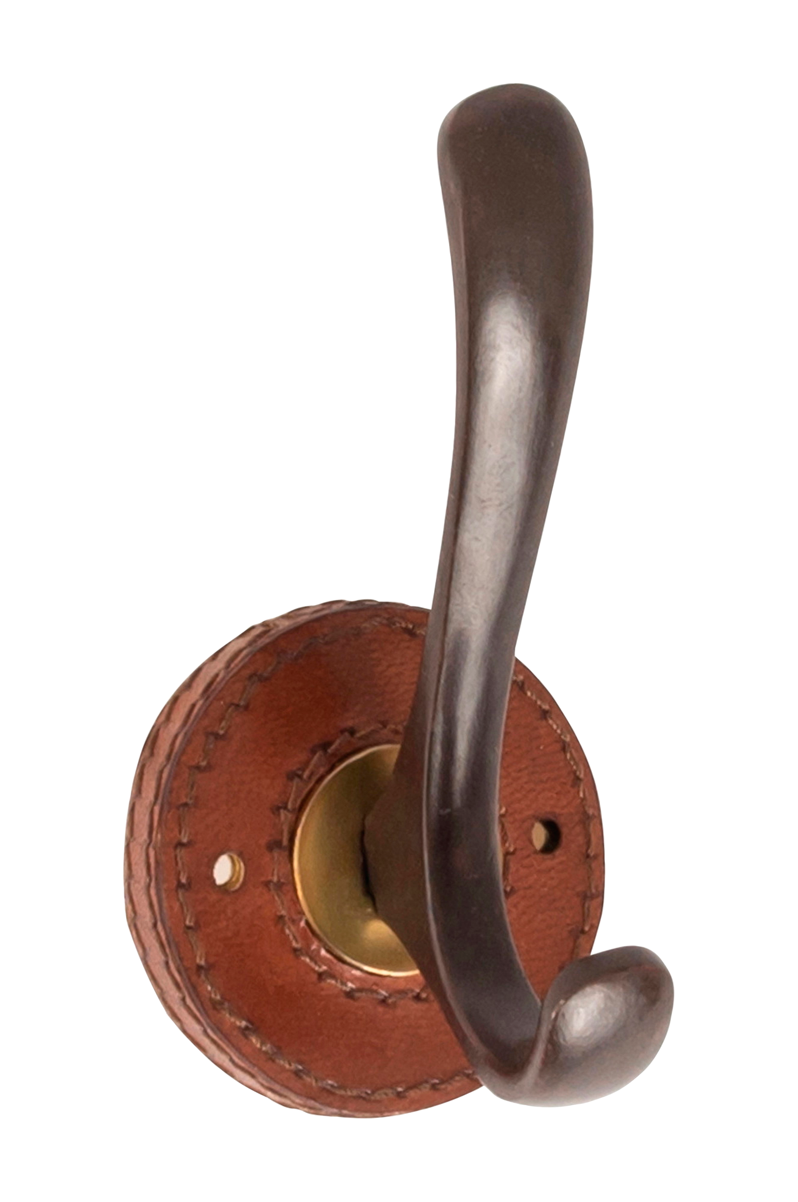Vægkrog i metal med et rundt, varmt brunt læderbeslag, designet af halvor bakke. materiale: metal, ægte læder
