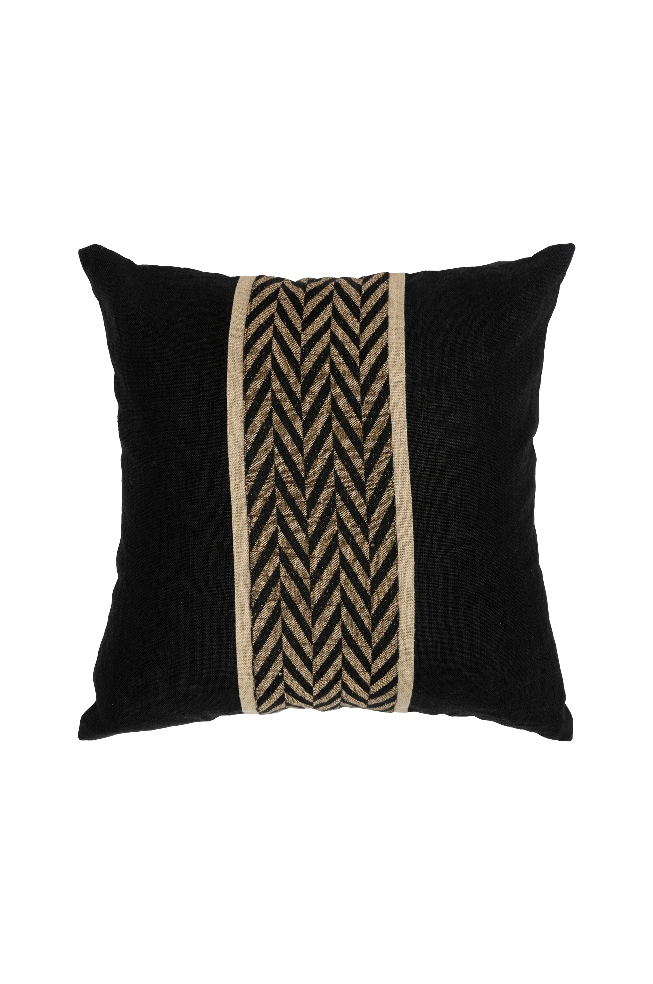 Sort hørpude fra halvor bakke med en enkel dekorativ stribe i midten, der elegant skaber en markant kontrast. 50x50 cm. Forside: 70 % hør, 30 % bomuldsvelour, bagside: 100 % bomuld. Inderpude medfølger ikke. Halvor bakke-design.