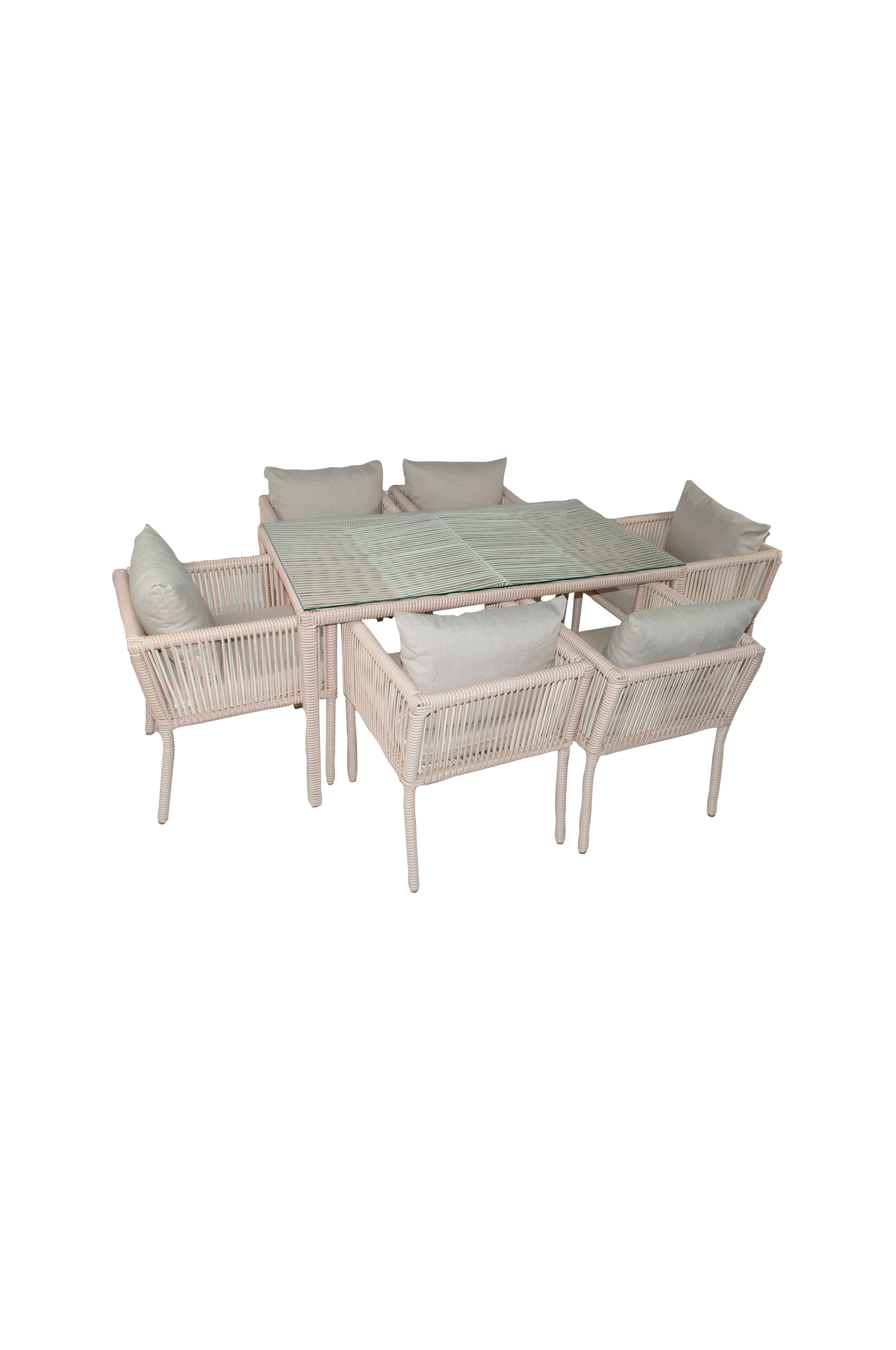 Stel: 100% aluminiumbordplade: 100% hærdet glasmodstandsdygtigt over for pletterbordets mål: bredde: 150 cm højde: 75 cm dybde: 90 cm (1 stk.)stolens mål: bredde: 60 cm højde: 70 cm dybde: 58 cm (6 stk.)