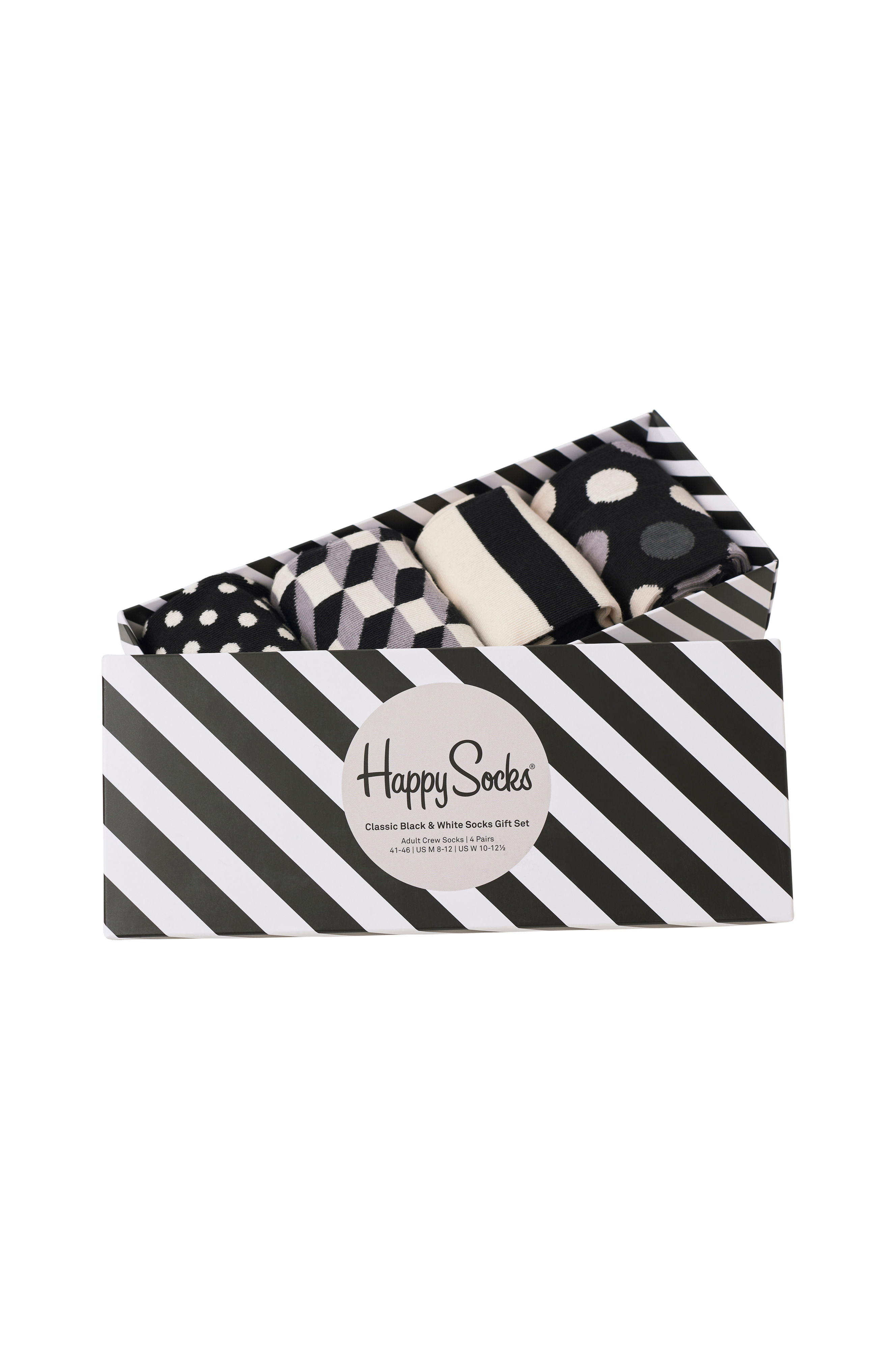 Gaveæske fra Happy Socks, som indeholder fire par strømper med forskellige mønstre sort og hvid. Ribkant på skaftet.
