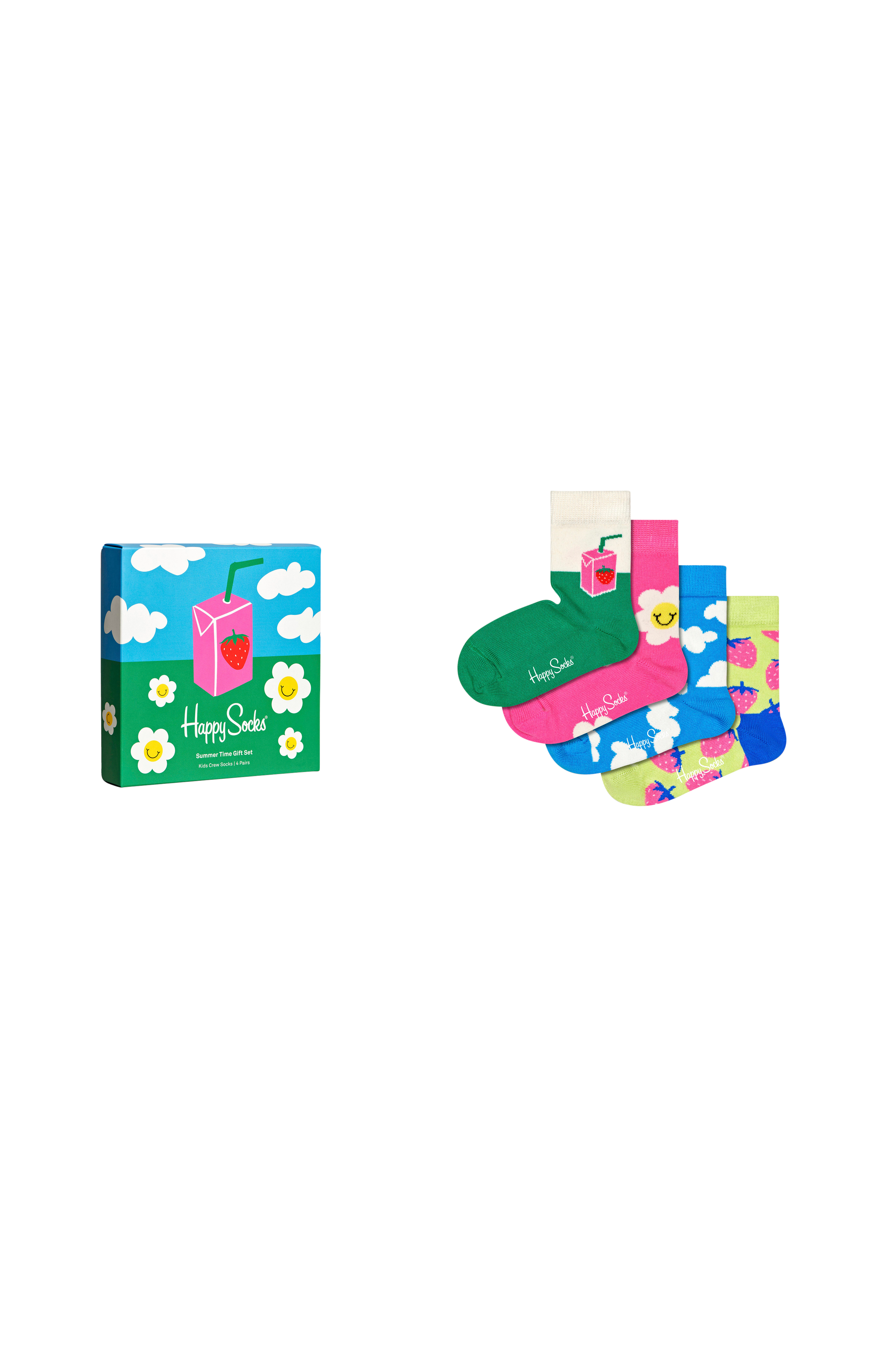 Gaveæske fra Happy Socks, som indeholder fire par strømper med mønstre i forskellige farver. Ribkant på skaftet.