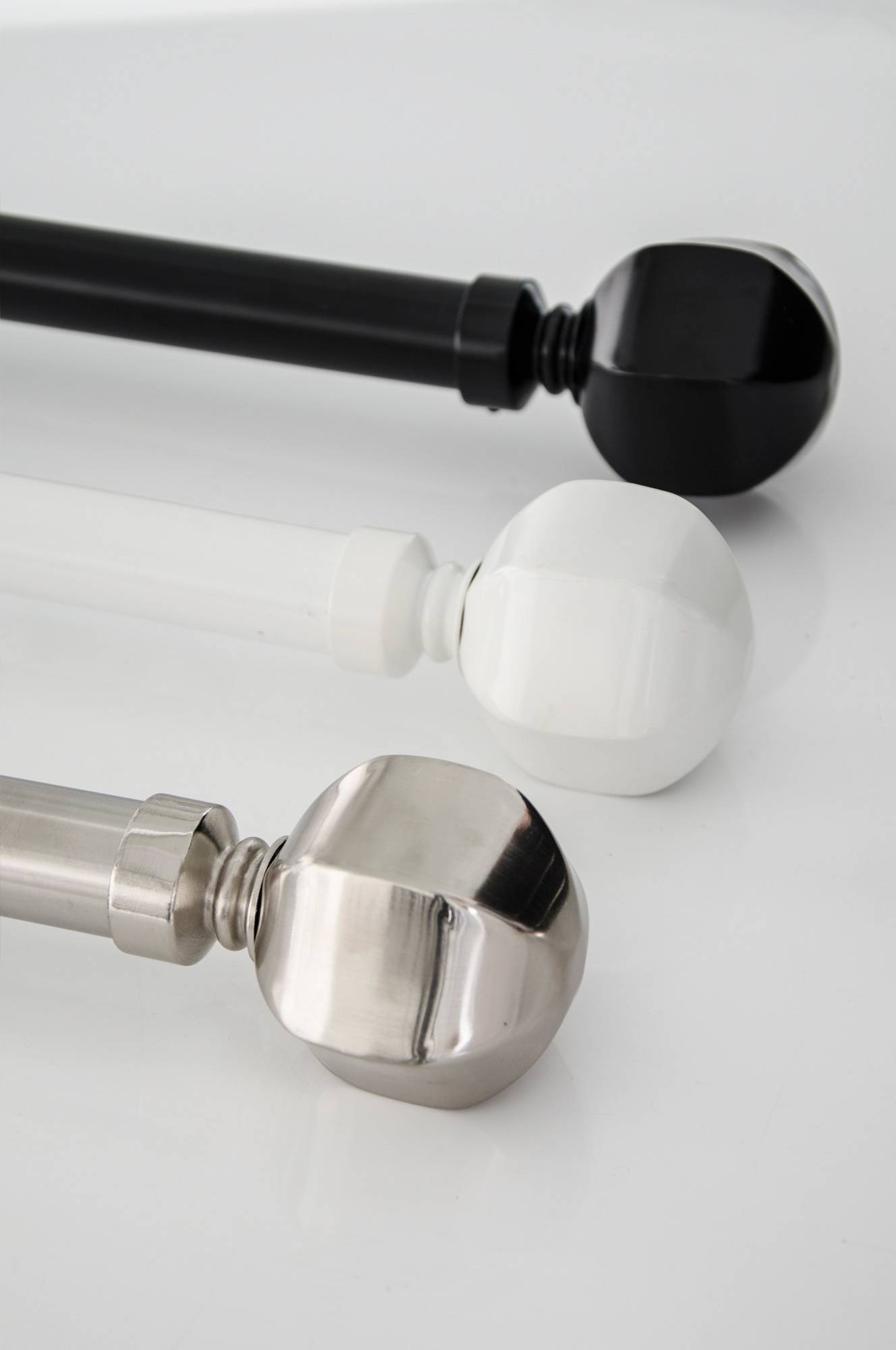 Komplet klassisk gardinstang-sæt i metal, 25/28 mm. Sættet indeholder justerbare stænger 130-240 cm, 2 stk. endeknopper og 3 stk. vægbeslag (8 cm).