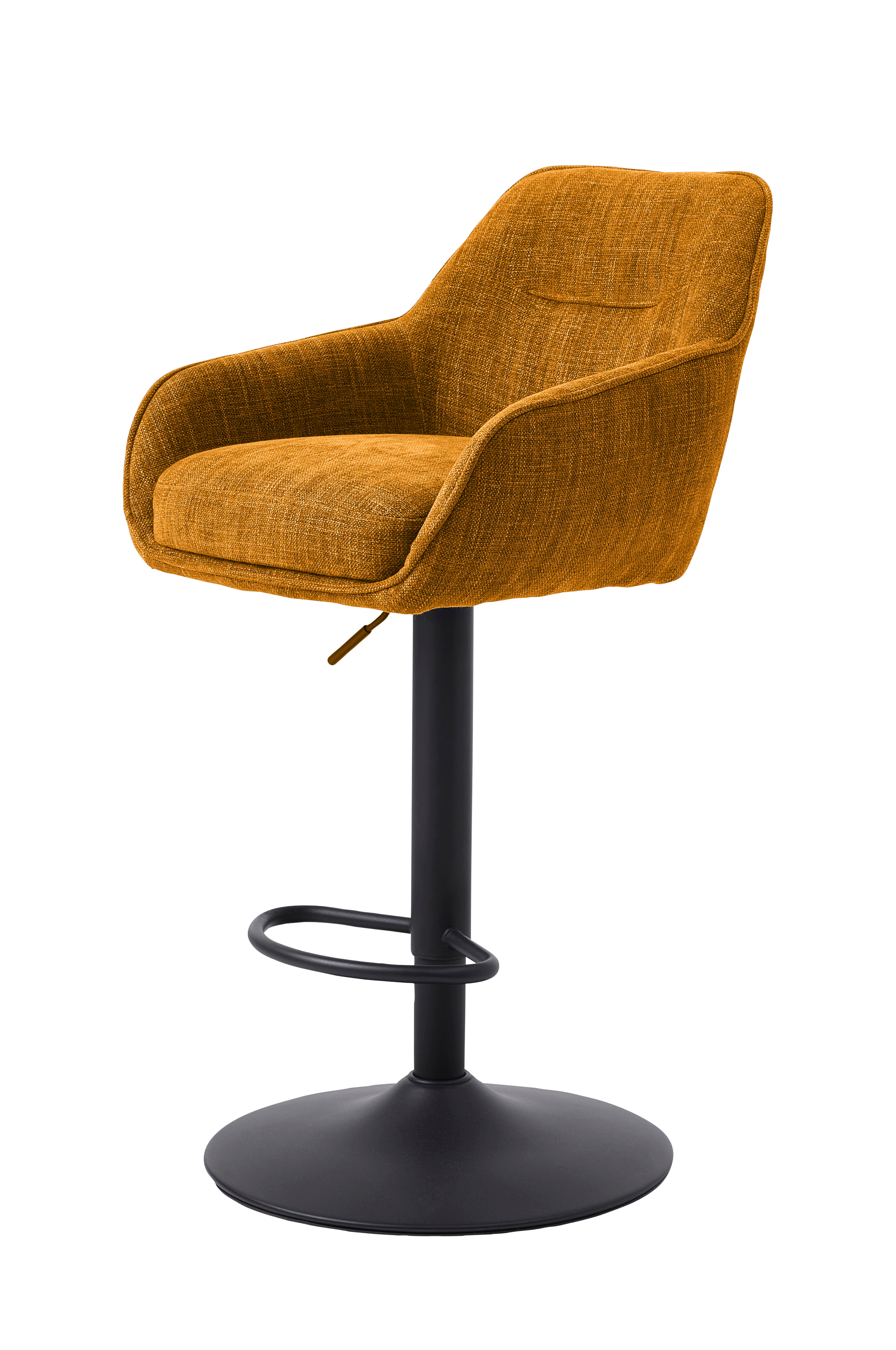 Denne barstol har et skandinavisk design, der ubesværet passer ind i ethvert hjem. Den har et polstret sæde og ryglæn kombineret med en elegant trompetfod i sort metal, der giver stabilitet og en moderne æstetik. Justerbar sædehøjde: 95,5-110 cm,