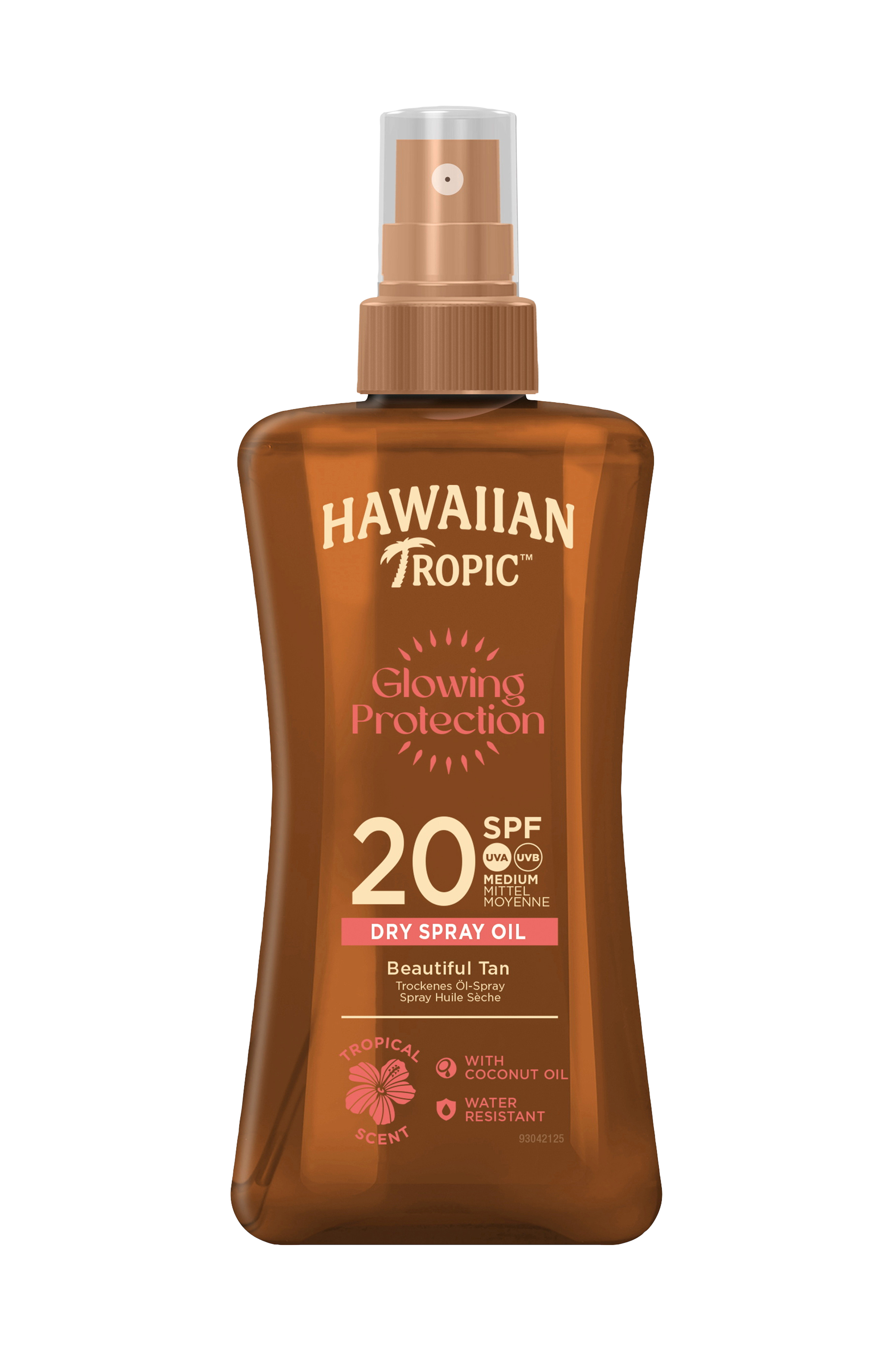 Glowing Protection Dry Oil Spray fra Hawaiian Tropic er en beskyttende tør olie, der hurtigt trænger ind i huden uden at udtvære og uden at føles fedtet. Med en udsøgt formel med kokos- og arganolie beskytter den huden samtidig med, at den fugter og blødgør.